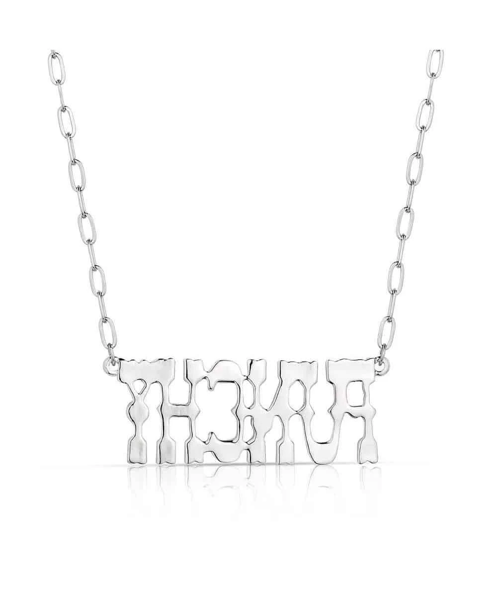 Rhodium Over Brass Base; Features The Word: “Punchy” For The Pendant; Three Turquoise Stones Are Embedded Throughout With Engraving Accents; Crafted Turquoise; 17″ Adjustable Chain; Protective Coating; Measures Approximately: 2″ W x 0.7″ H; Style #NC5962