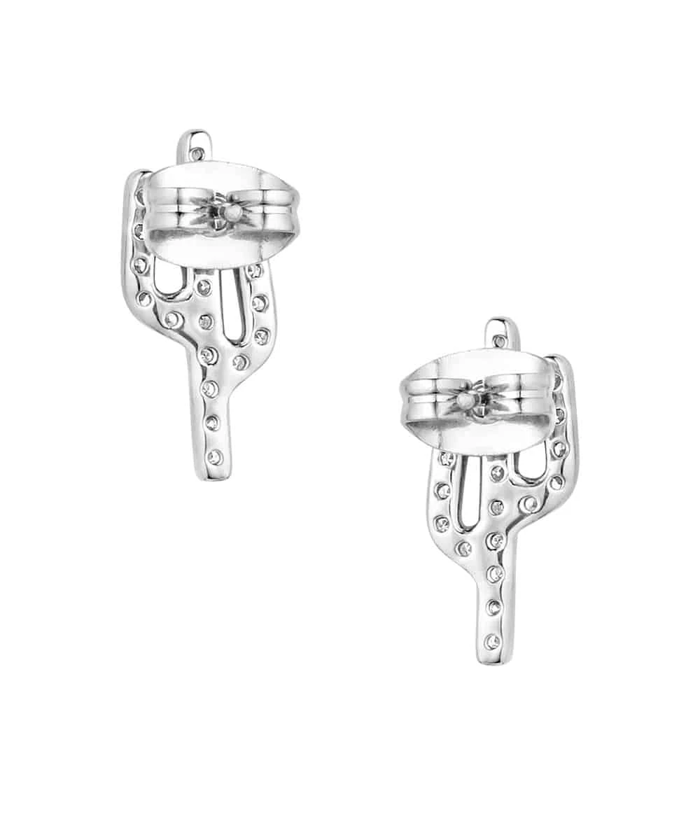 Rhodium Plated Over Brass; Cactus Shaped Earrings Filled With Clear Cubic Zirconia Crystals; Protective Coating; Secured By Hypoallergenic Post Back Wires; Measures Approximately: 0.3″ W x 0.6″ H x 0.3″ L; Style #ER5868