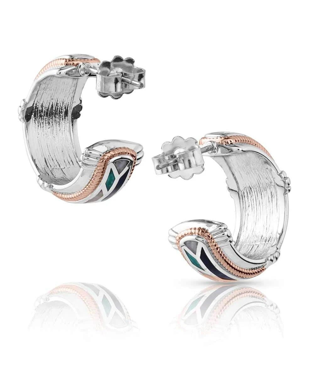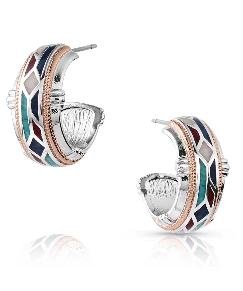 Rhodium And Rose Gold Over Brass; Hoop Style; Mosaic Pattern Through The Center With Silver Tone Creating Clear Lines Between The Inlays Of Bold Red, Vibrant Green, Dark Blue, And Bright White; Rose Gold Finished Rope Frames The Center; Smooth Silver Tone Edge With Detailed Embellishments; Stainless Steel Hypoallergenic Post Back Wires; Protective Finish; Measures Approximately: 0.37″ W x 0.74″ H x 0.3″ L; Style #ER5690