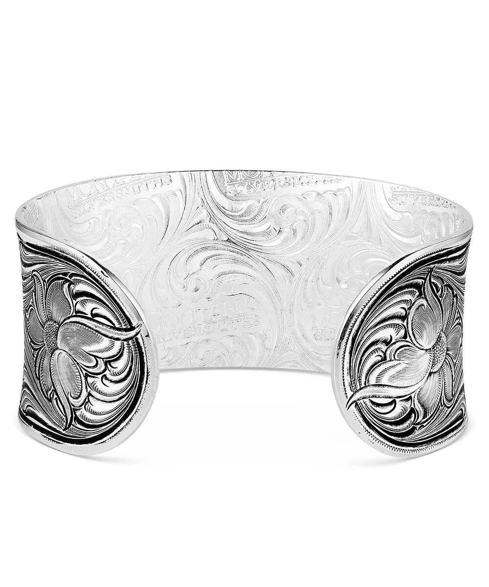 99.99% Fine Silver Plated Over Brass Base; Detailed Engraving On Silver Tone; 3 Engraved Flowers Surrounded By Intricate Engraving; Deep Antiquing; Montana Armor To Prevent Tarnish; One Size Fits Most; Measures Approximately: 1.3″ W x 0.1″ H x 6.5″ L; Style #BC5670