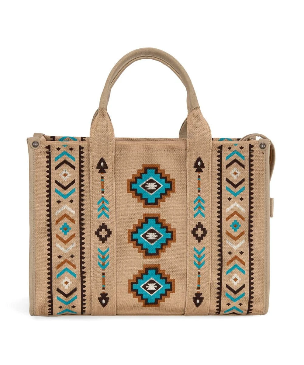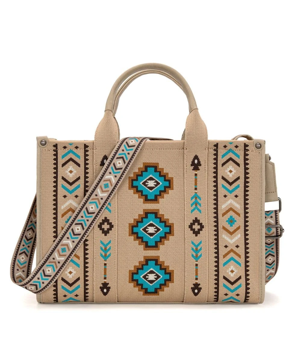 Made Of Canvas And PU Leather Trimmed; Large Tote/Crossbody Purse; Aztec Retro Arrows Print On Dual Sided Canvas; 5″ Double Round Carry Handles; Top Zipper Closure; Inside Of The Bag Includes A Zippered Pocket, Padded Compartment, And An Open Pocket; 54″ Removable/Adjustable Aztec Print Crossbody Strap; Measures Approximately: 14.5″ x 5.5″ x 10.8″; Color: Tan; Style #MW1333-8113TN