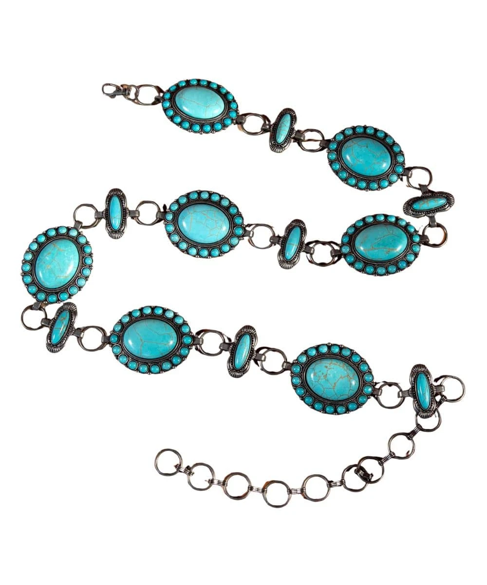 Rustic Silver Tone Hardware; Scalloped Oval Conchos Filled With Turquoise Stones; Adjustable Chain; Lobster Clasp Closure; Belt Body Length: 36″ With 10″ Extension; Color: Turquoise/Silver; Style #CB-1005TQ