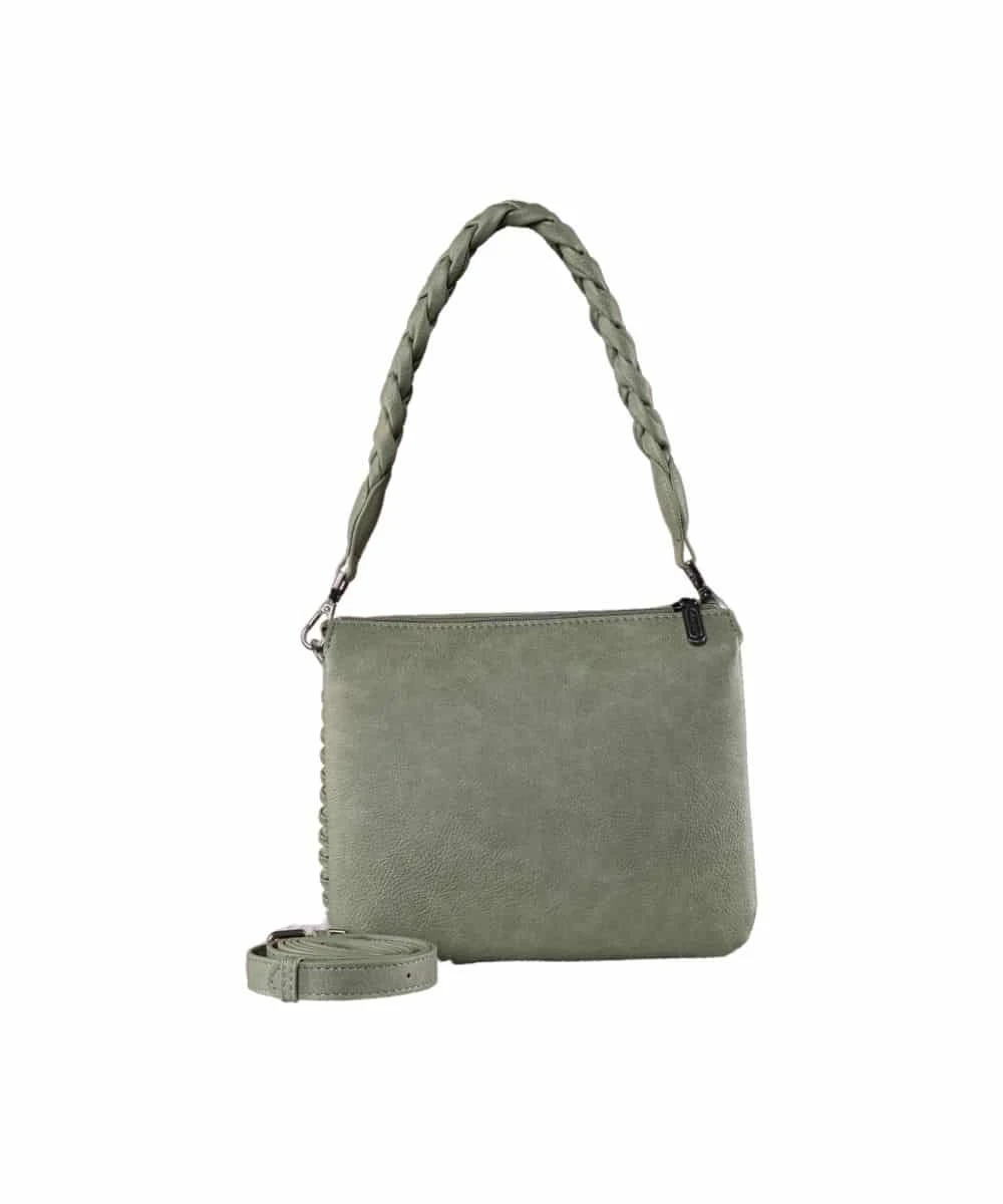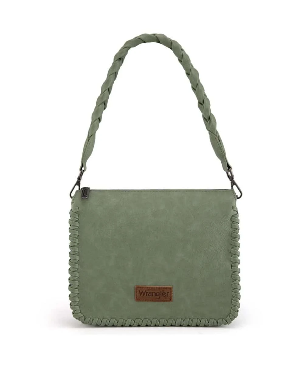 Hobo/Crossbody Bag; PU Leather; Wrangler Logo Leather Applique On Front; Whipstitch Trim; 8″ Braided Removable Shoulder Strap; Top Zipper Closure With 3 Compartments; Zippered Pocket And An Open Pocket Inside Bag; 46″ Removable/Adjustable Crossbody Strap; Measures Approximately: 10″ x 2″ x 8″; Color: Green; Style #WG183-8312GN