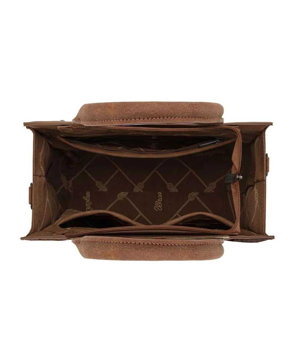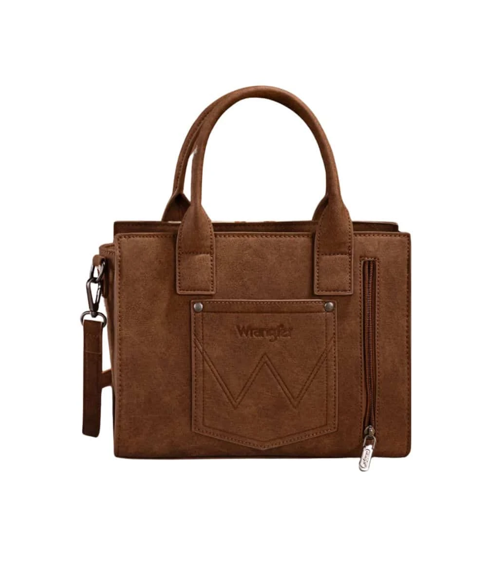Made Of PU Leather And Tapestry; Tote/Crossbody Purse; Front Of Purse Features Floral Tooling, Whipstitch Details, And Aztec Retro Print On Tapestry With Wrangler Logo Applique; 5″ Double Round Carry Handles; Top Zipper Closure; Inside Of The Bag Includes A Zippered Pocket And An Open Pocket; Concealed Carry Zippered Pocket On Back That Measures Approximately: 8″ x 6″; Open Pocket On Back With ‘W’ Logo Stitching; 46″ Removable/Adjustable Crossbody Strap; Measures Approximately: 10.75″ x 3.25″ x 8.25″; Color: Brown; Style #WG226-8120BR