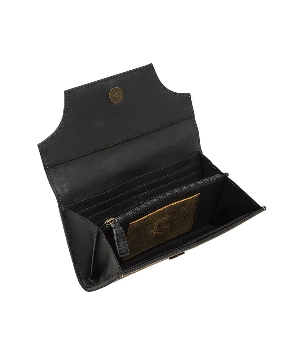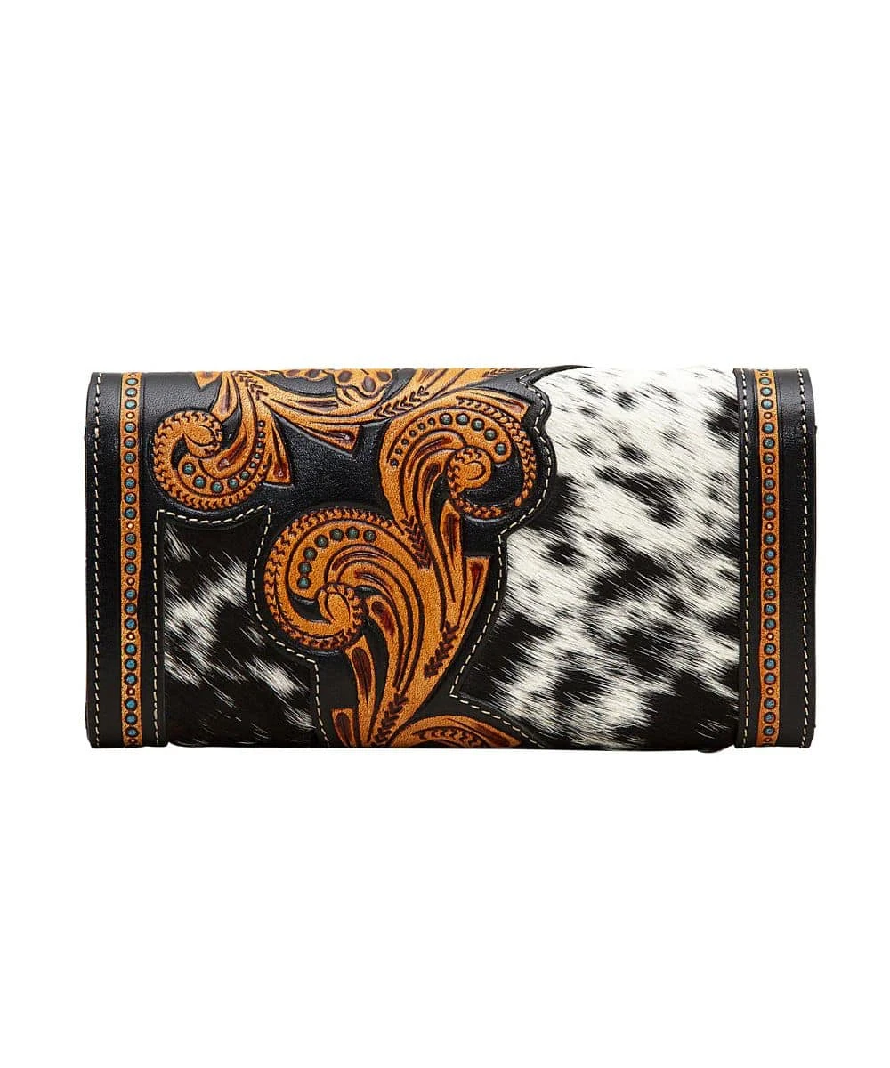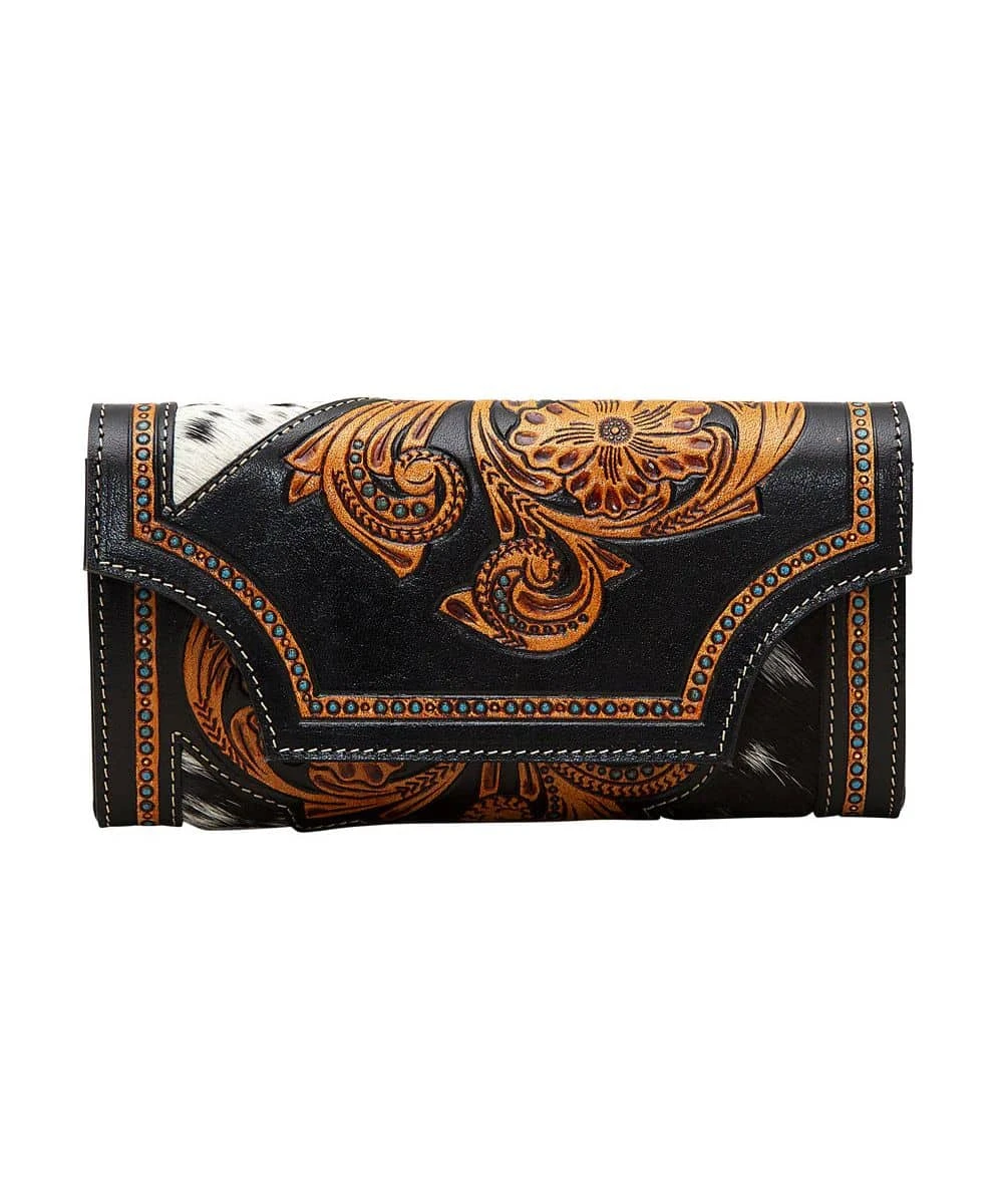 Hair-On Hide Leather Wallet; Vibrant Bronze Embroidery With Turquoise Spots; Unique Flap Design With Snap Closure; Zipper Pocket And Card Slots Insides; Measures Approximately: 8″ W x 4″ H; Color: Black; Style #S-5852