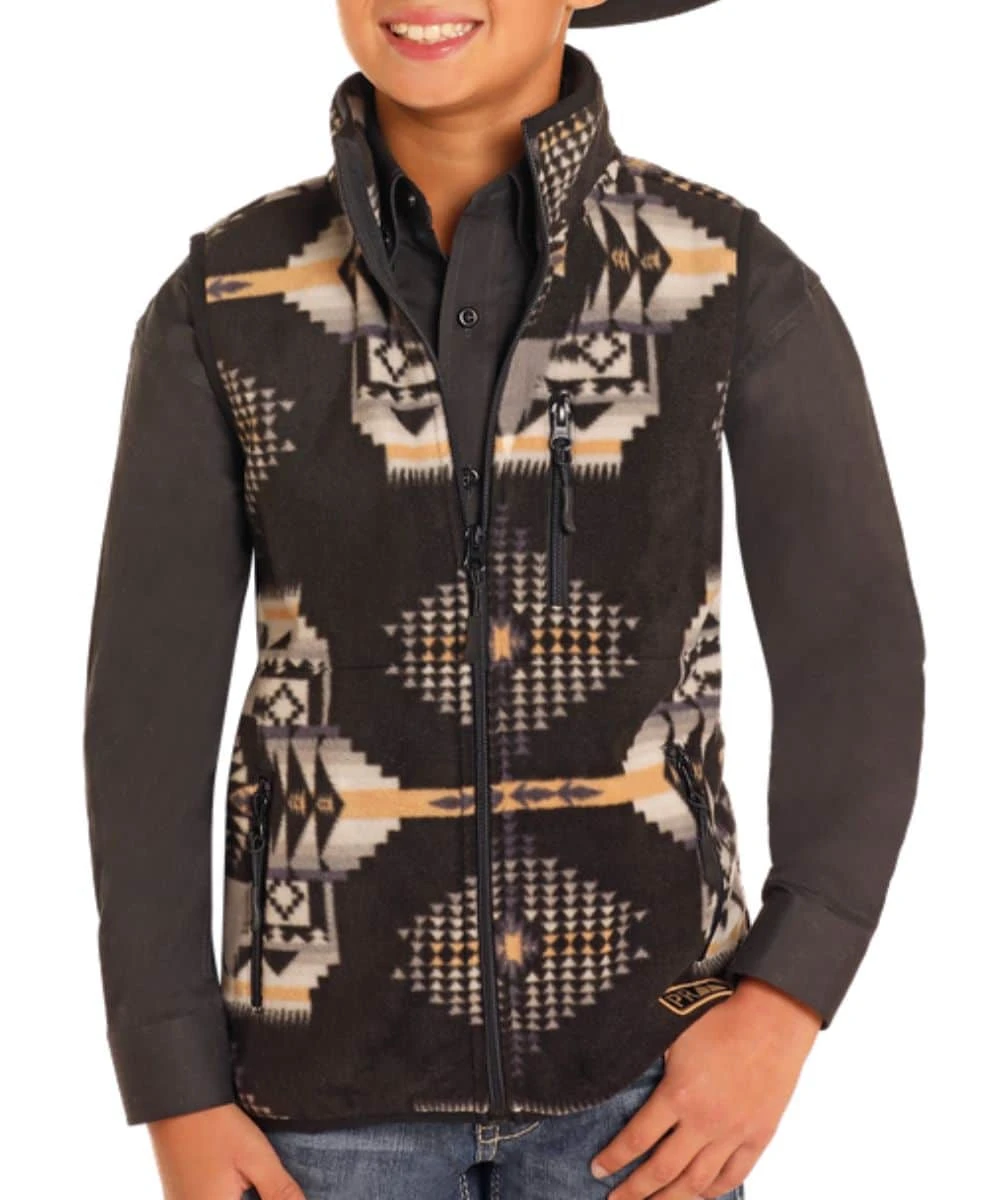 95% Polyester/5% Spandex; Sleeveless Vest; Mock Collar; Full Zip Closure; Zippered Chest And Hand Pockets; Powder River Label At Waist; Aztec Print; Color: Black; Style #DK98C04093