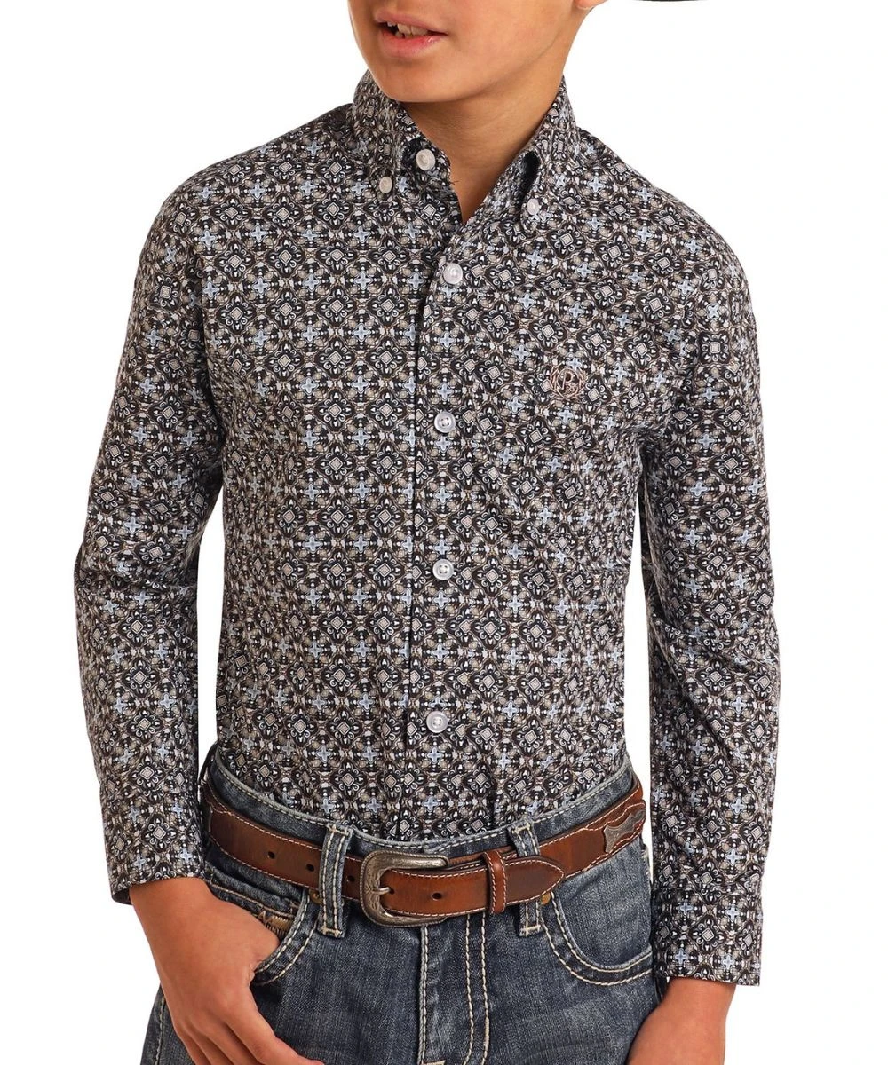 97% Cotton/3% Spandex; Long Sleeves; Button Down Collar, Placket, And Cuffs; Single Open Chest Pocket With Logo Embroidery; Medallion Geometric Print; Color: Black; Style #PBB2S05390