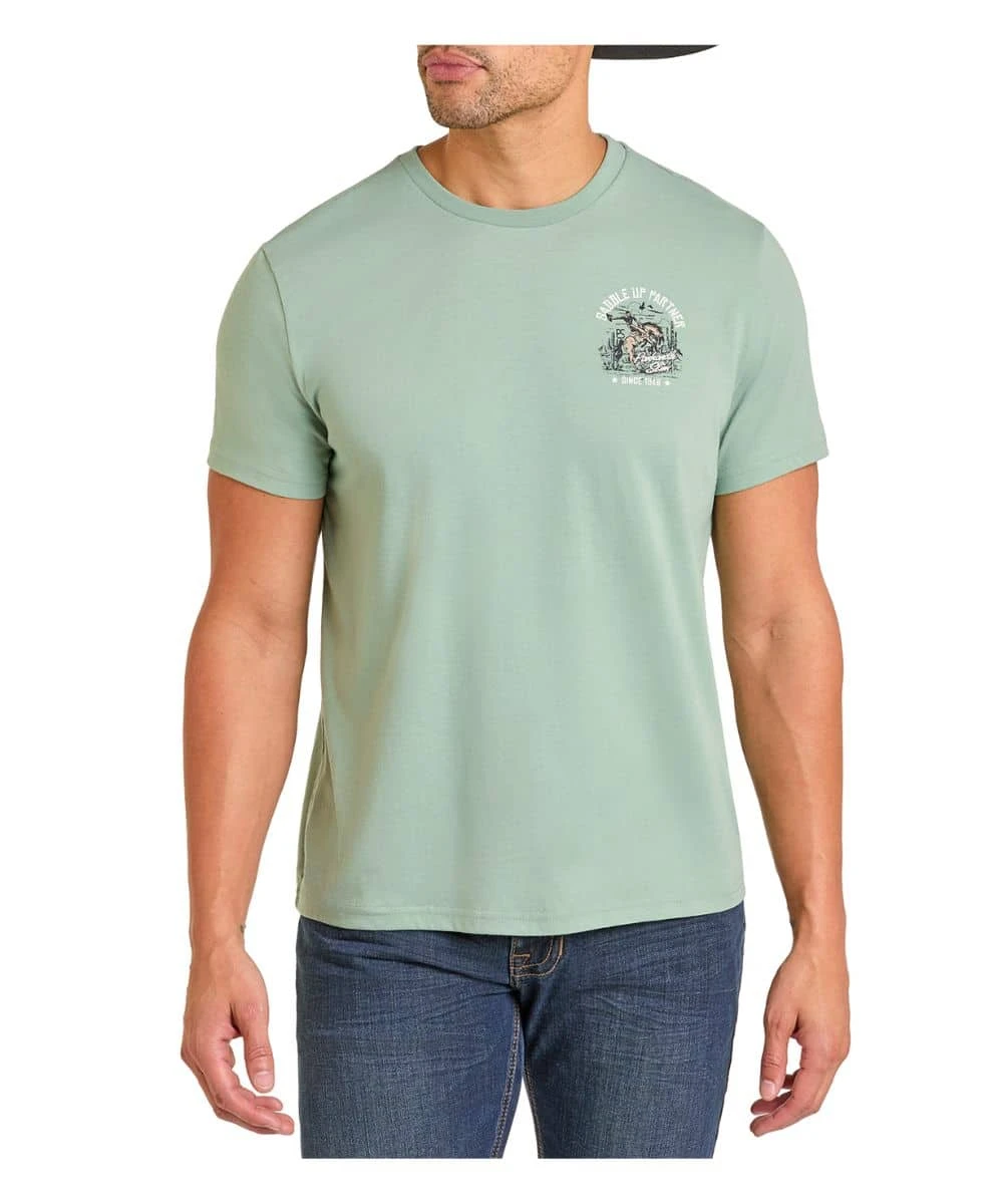 60% Cotton/40% Polyester; Modern Vintage Graphic Tee; Short Sleeves; Crew Neck; Small Screen Print On Chest; Large Screen Print On Back Reads: “Saddle Up Partner” With Bucking Horse Graphic; Color: Jade; Style #PU21T06932