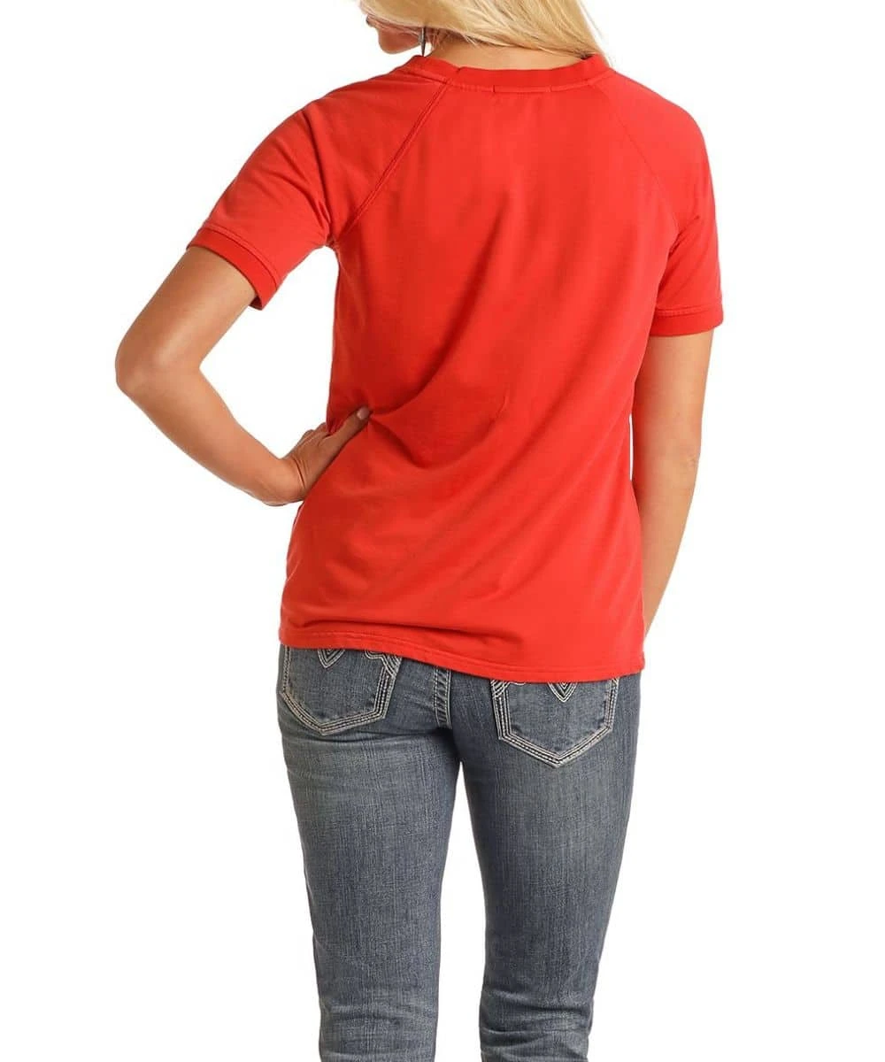60% Cotton/40% Polyester; Slim Fit; Short Raglan Sleeves; Crew Neck; Front Screen Print Reads: “Western Rodeo Days” With Bucking Horse/Star Graphic; Color: Scarlet Red; Style #LW21T05826