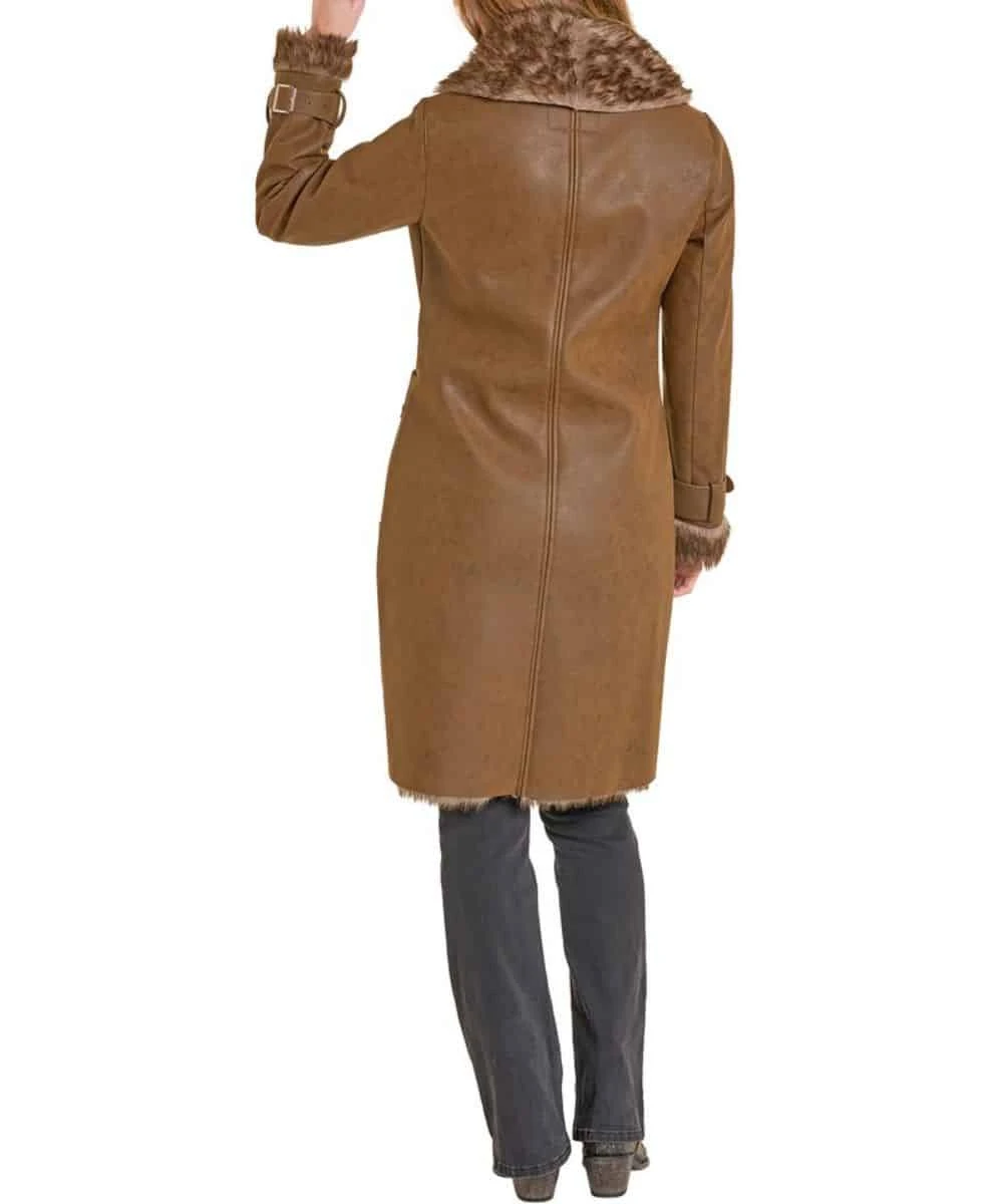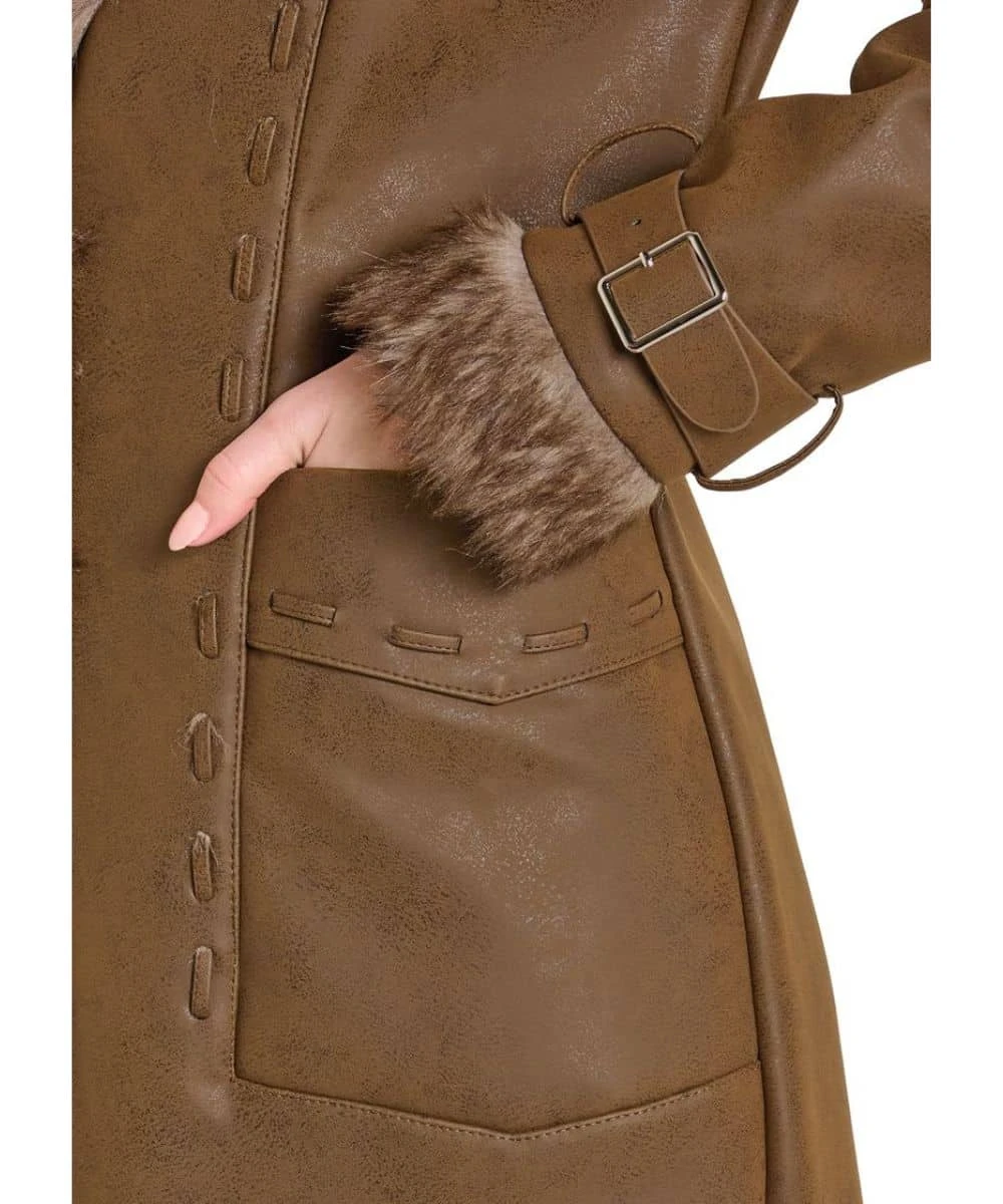 100% Polyester; Long Sleeves; Spread Collar; Button Closure; Faux Fur Trim And Lining; Hand Pockets; Adjustable Buckle Cuffs; Laced Pleather Details; Distressed Pleather Long Coat; Color: Mahogany; Style #DW92C06873