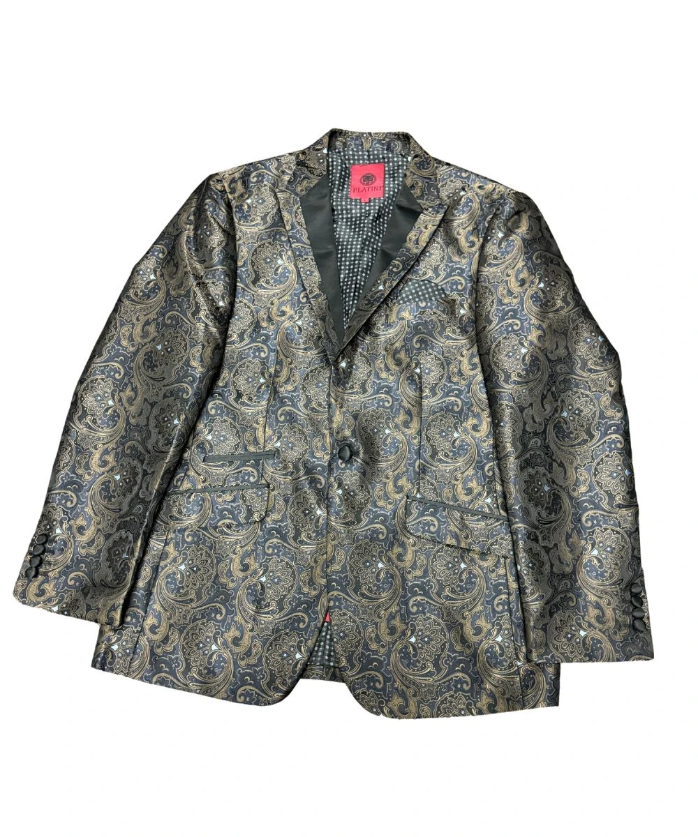 100% Polyester; Long Sleeves; Pointed Lapel Collar; Single Chest Pocket; Double Button Closure; Front Welt Pockets At Hip; Button Cuffs; Dry Clean Only; Color: Black/Gold; Style #BLZ9636
