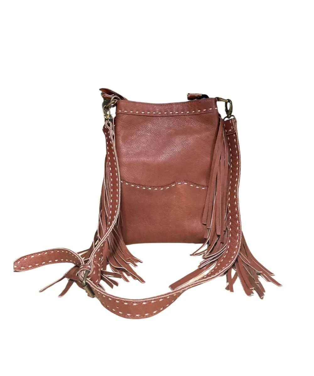 Genuine Leather Bag From The Santa Fe Collection; Tribal Woven Inlay On Front; Fringe On Sides; Contrast Decorative Stitching; Zipper Closure; 100% Cotton Lining; Adjustable Leather Shoulder Strap; Made In Thailand; Measures Approximately: 12″ H x 9″ W; Style #SANTA FE-ALTURA