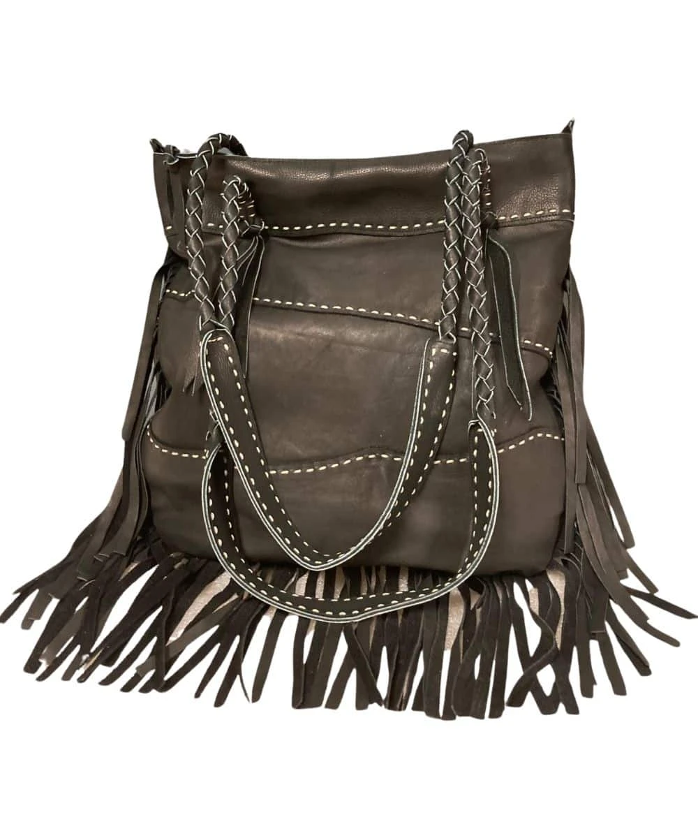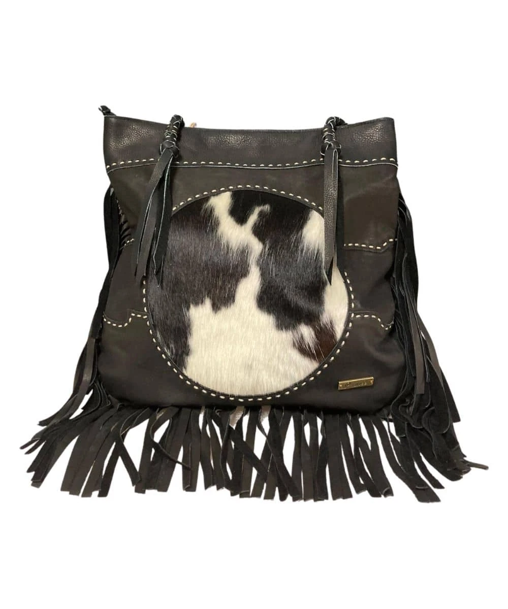 Genuine Leather Bag From The Cheyenne Collection; Genuine Hair On Cowhide Front; Fringe On Sides And Bottom; Contrast Decorative Stitching; Zipper Closure; 100% Cotton Lining; Interior Side Pockets And Zipper Pocket; Leather Shoulder Strap; Made In Thailand; Style #CHEYENNE-HANNAH