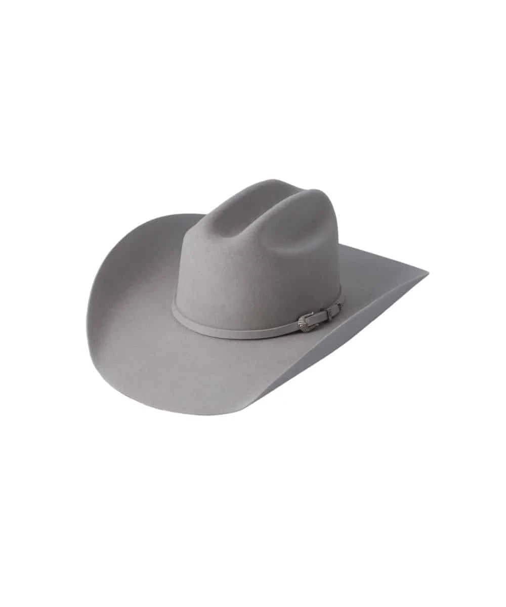 Wool Felt; 4 1/4″ Brim; Cattleman Crown; Matching Self Band With Silver Buckle Closure; Dry-Lex Sweat Band; Color: Grey/Silver; Style #SILVER CATT