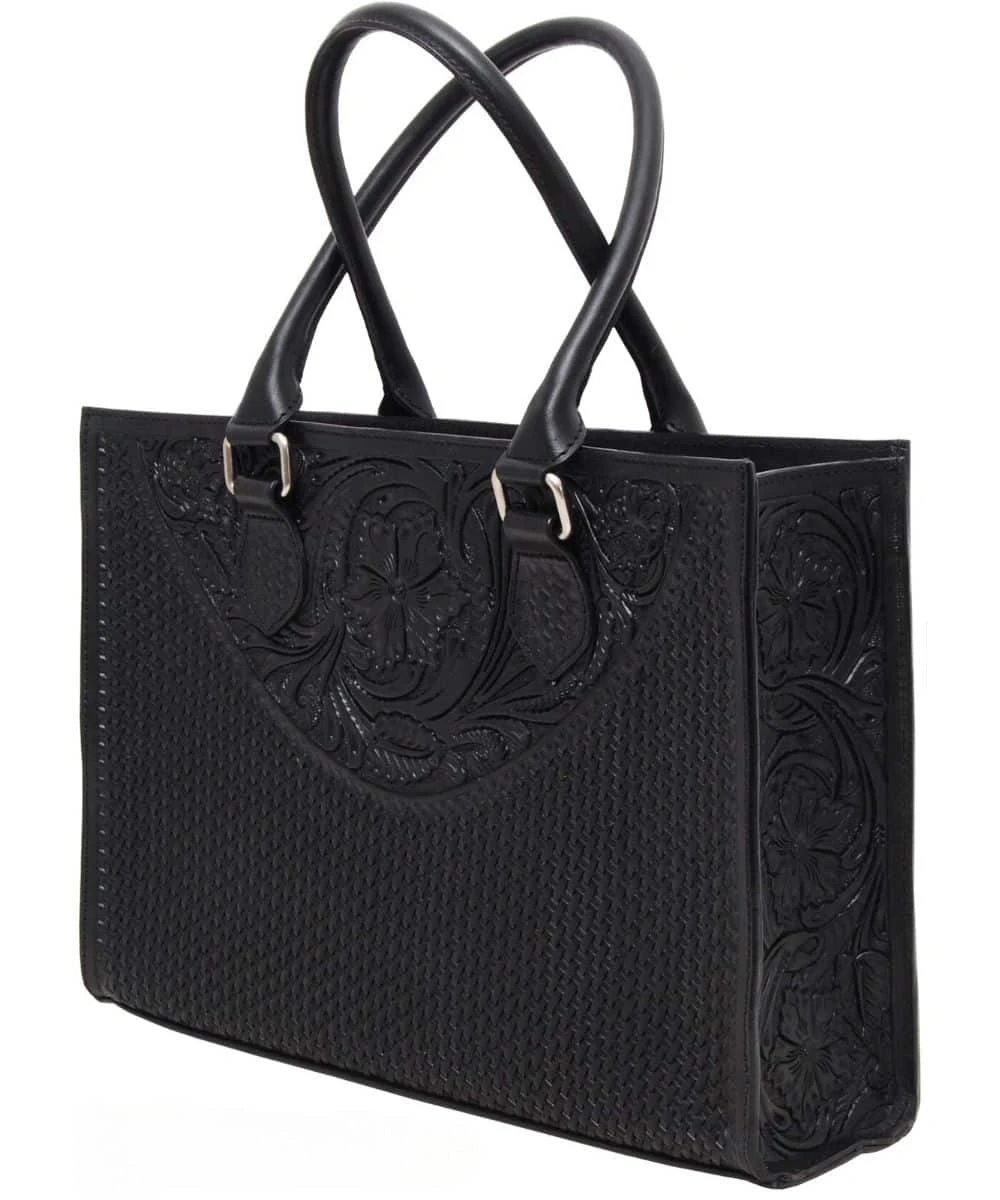 Black Leather; Floral And Basketweave Tooling; 1 Inside Zip Pocket; 2 Inside Slip Pockets; 8″ Straps; Measures Approximately: 11″ H x 12″ W; Style #BL647BK