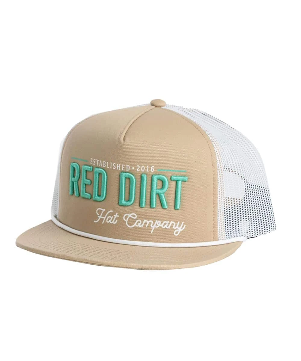 High Profile, Structured Crown; Khaki Front And Bill; Red Dirt Hat Co. Logo Embroidery On Front; White Rope Across Flat Bill; White Mesh Sides And Back; Snapback Closure; One Size Fits Most; Color: Khaki/White; Style #RDHC-527