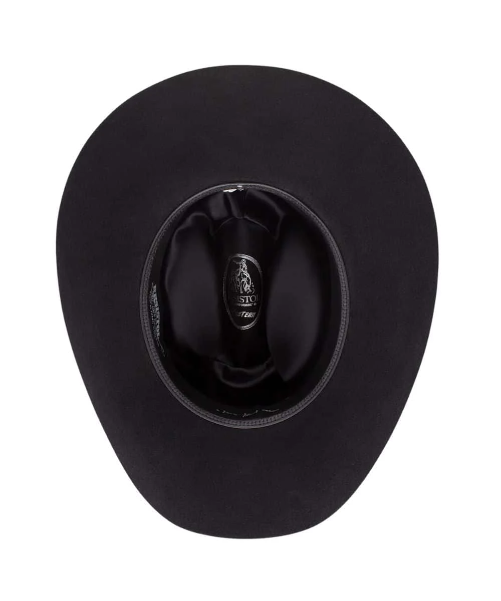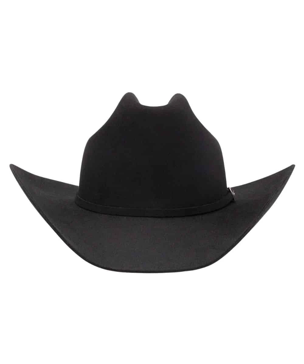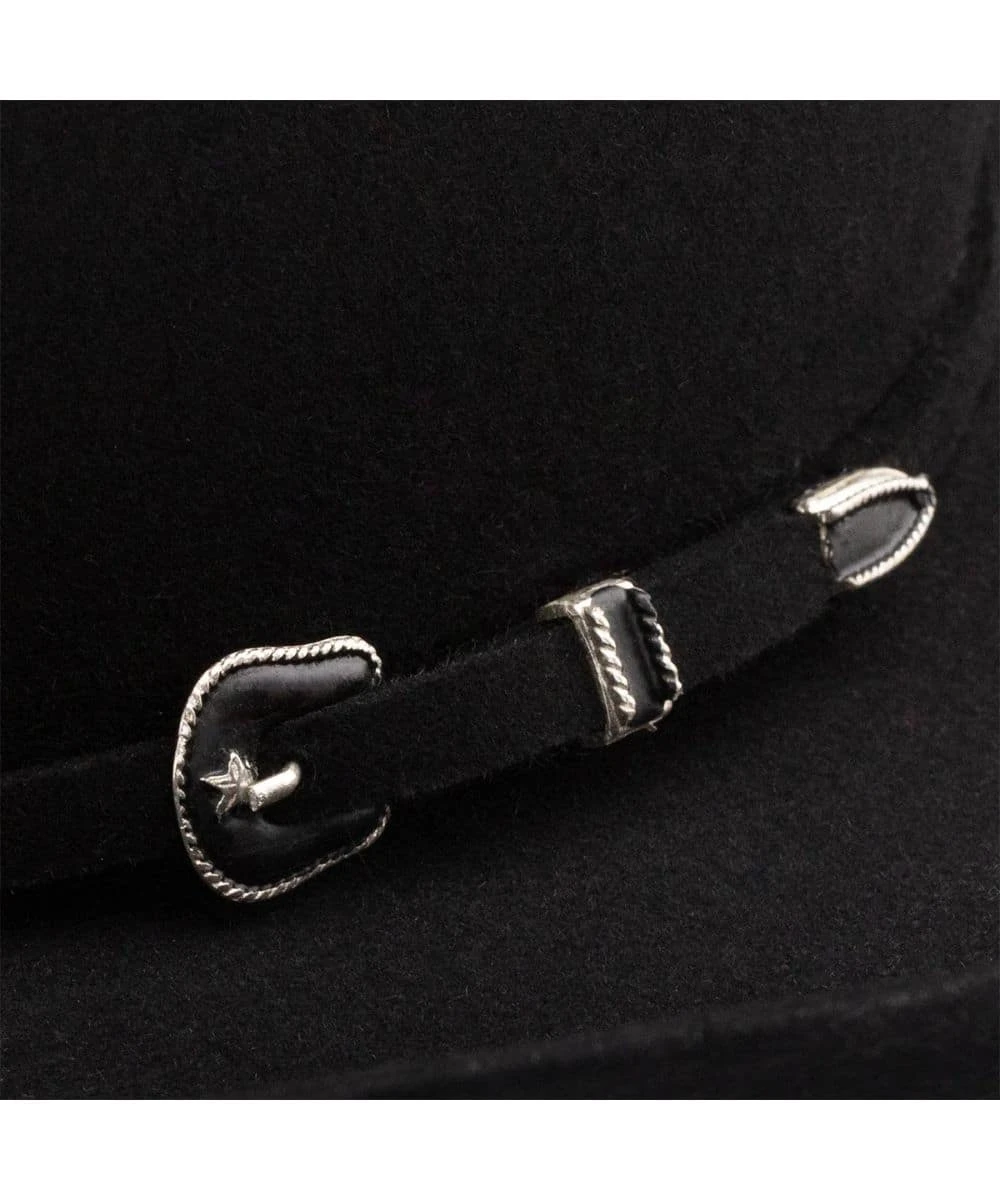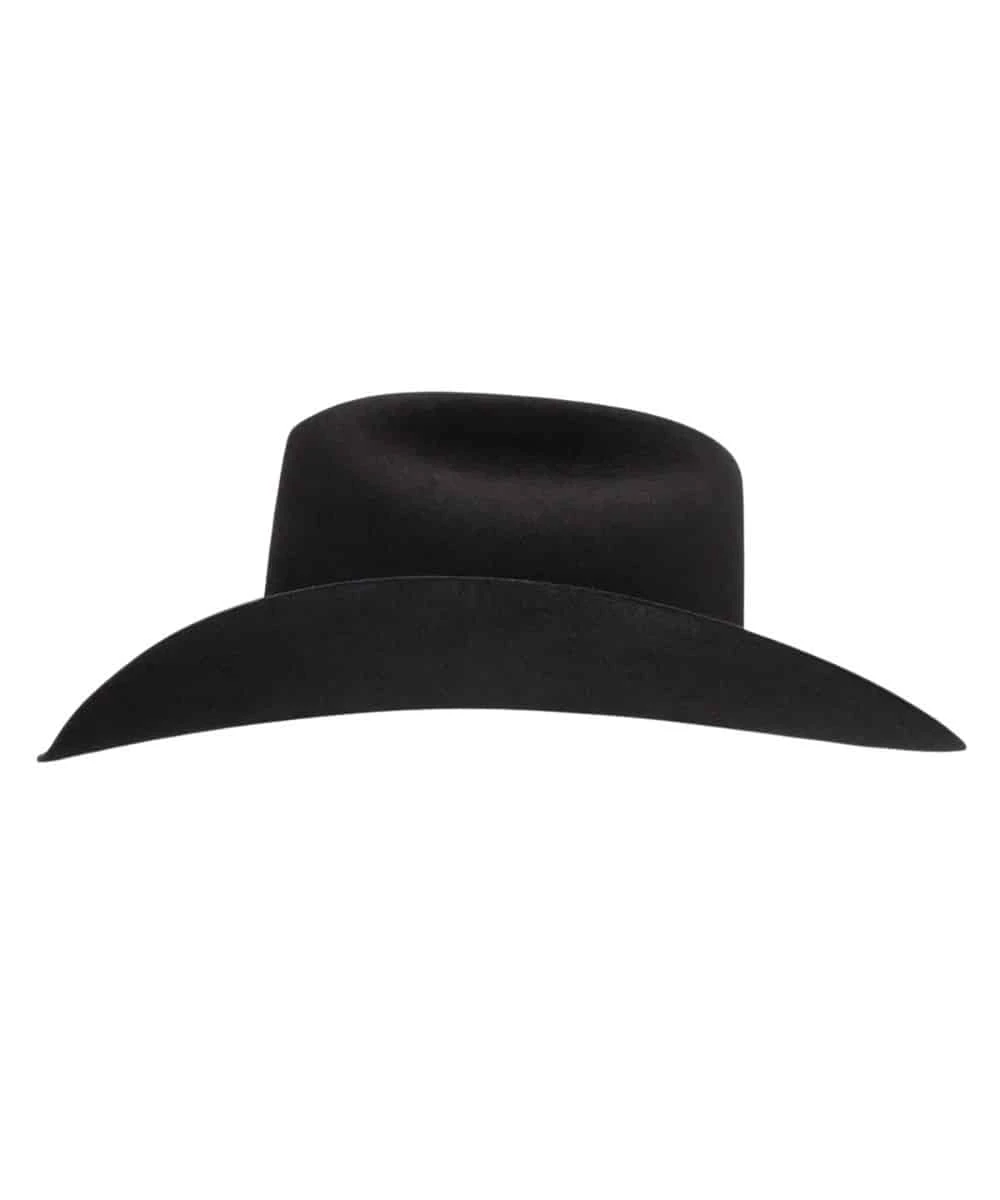 George Strait Collection; 6X Fur Felt; 4″ Curved Brim; 4 5/8″ Cattleman Crown; Matching Felt Hat Band With Three Piece Silver Tone Buckle; Leather Sweatband; Color: Black; Style #RFCTLM-7540 BLK
