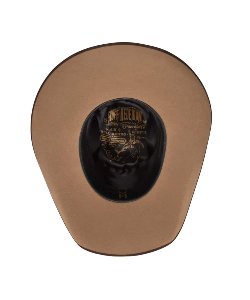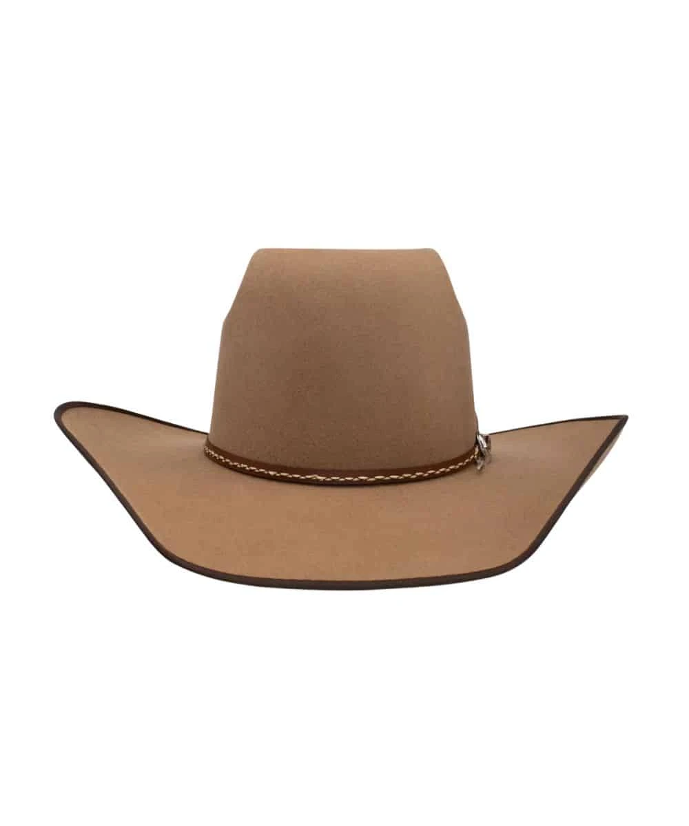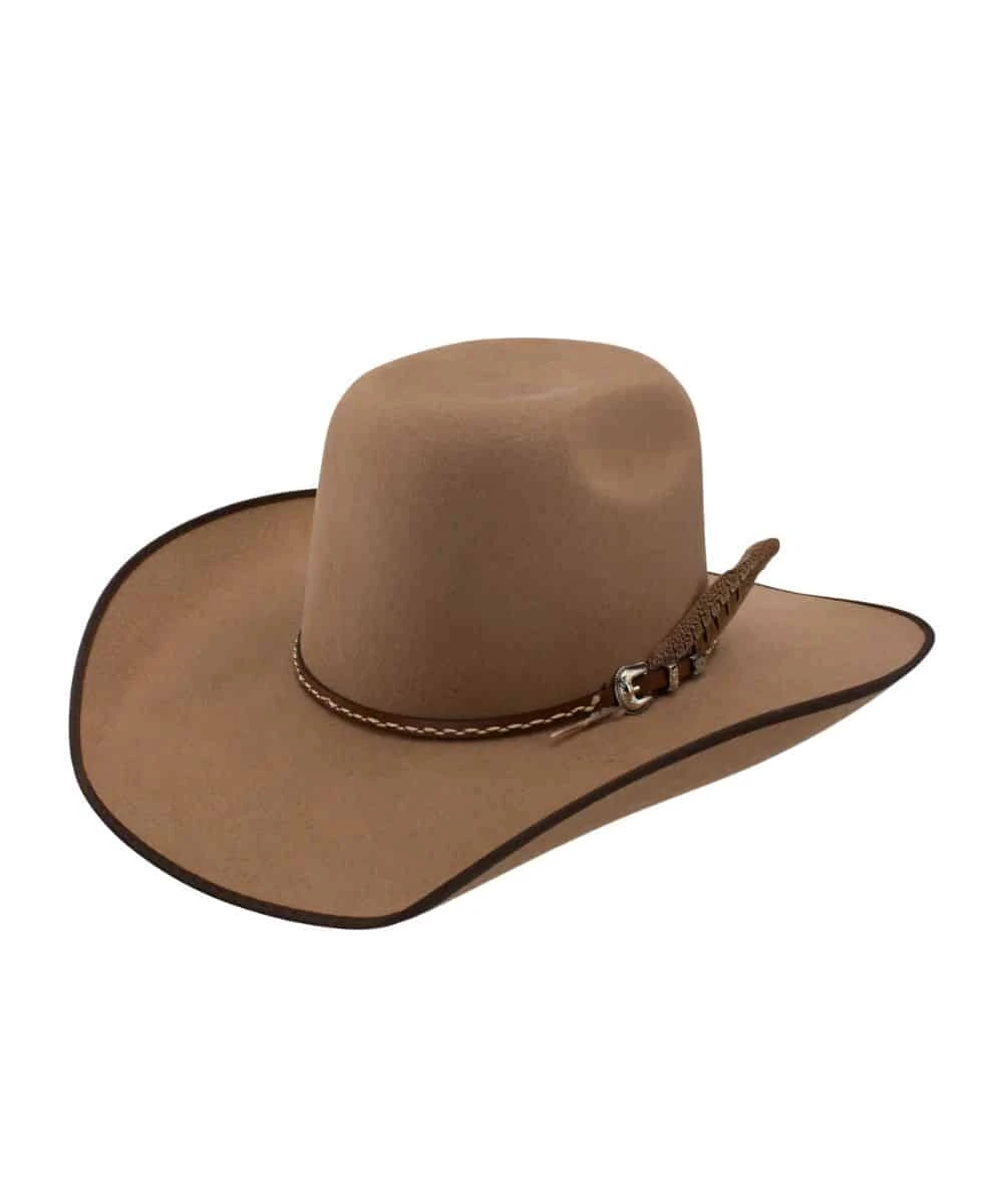 3X Wool; Tuff Hedeman Collection; 4 1/4″ Brim; 5 1/4″ Tall Rounded Brick Crown; Brown Hatband With White Stitchwork, Silver Hardware, And Feather; Leather Sweatband; Color: Pecan/Brown; Style #RWRKLDB9042