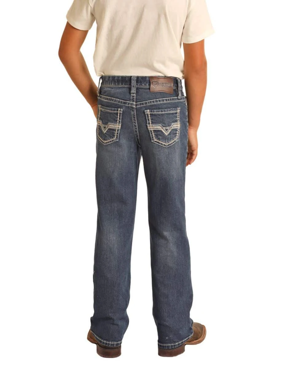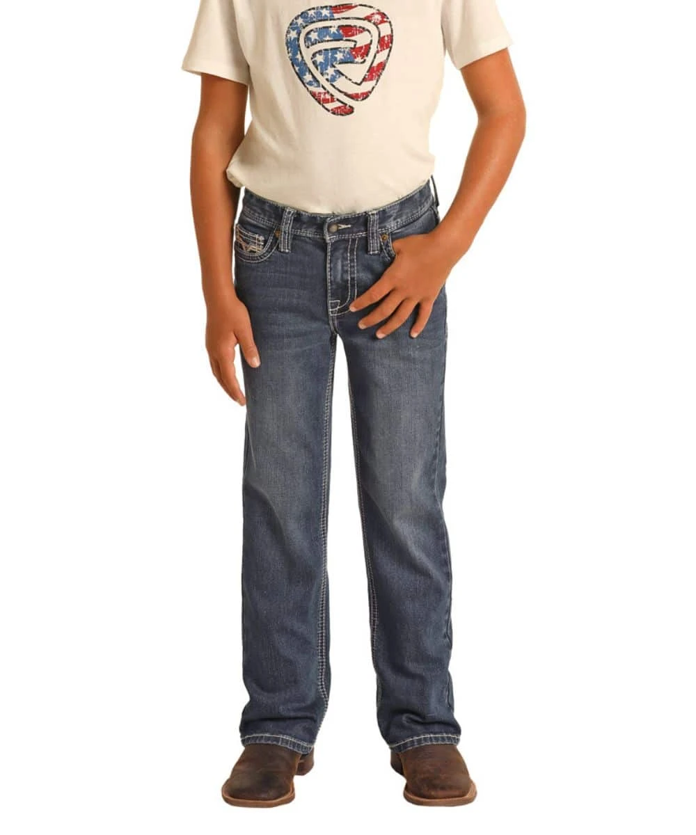 Regular Fit; Zip Fly With Button Closure; Five Pocket Styling; Light Whiskering Detail; Raised BB Gun Fashion Stitched Back Pockets; Boot Cut Jean; Color: Dark Vintage Wash; Style #RRBD0BR1GZ