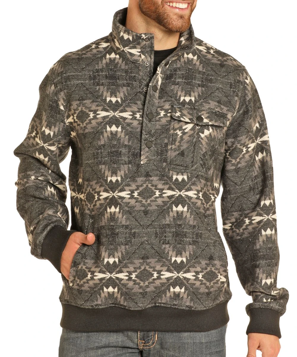 100% Cotton; Aztec Jacquard; Long Sleeves; Mock Collar; 5-Snap Placket Closure; Single Snap Flap Chest Pocket; Kangaroo Pocket; Ribbed Cuffs And Hem; Color: Black; Style #BM91C04336