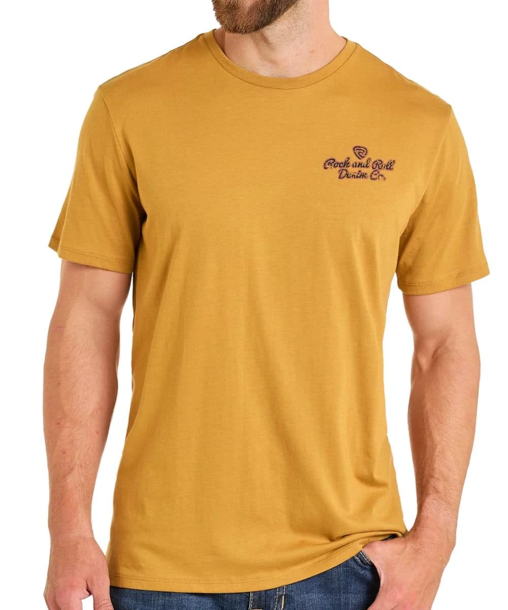 60% Cotton/40% Polyester; Short Sleeves; Crew Neck; Small Logo Screen-Printed On Chest; Large Screen-Printed Denim Co. Graphic On Back; Color: Gold; Style #BU21T06786