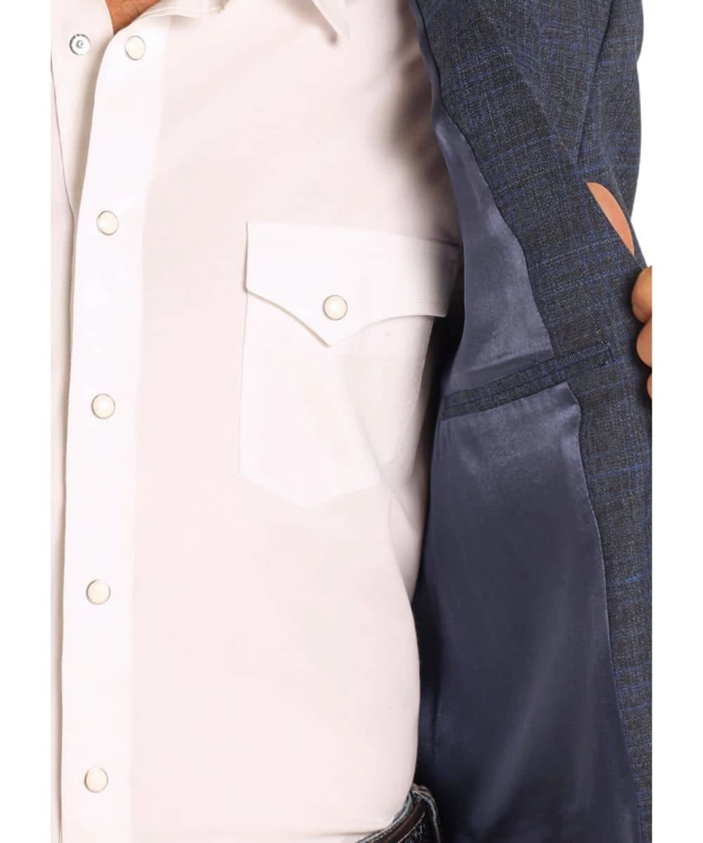 86% Polyester/12% Rayon/2% Spandex; Long Sleeves; Spread Notched Collar; 2-Button Front Closure; Slip Chest Pocket; Flap Hand Pockets; 2 Interior Pockets; Lined Interior; Charcoal Plaid Print; Color: Indigo; Style #BM96C03706