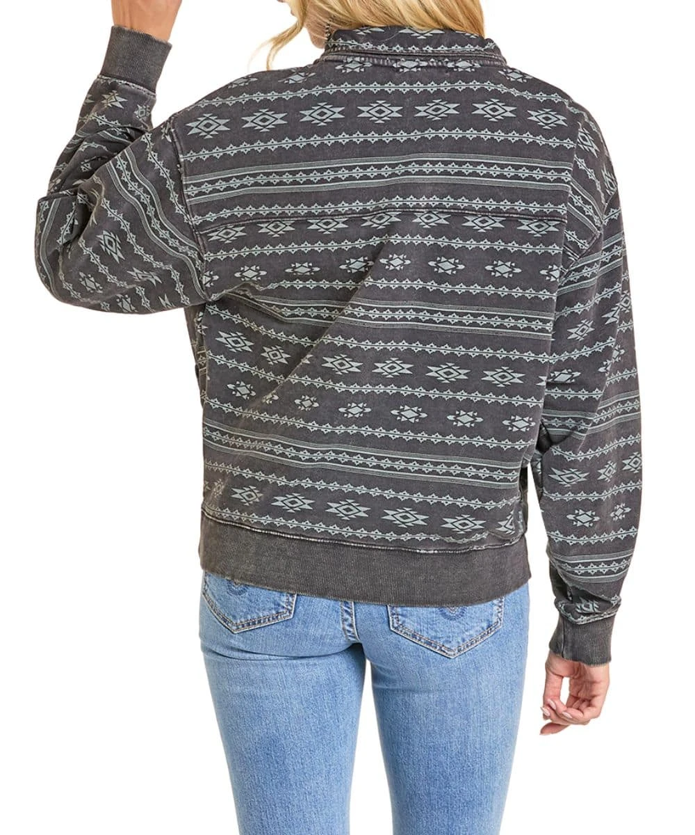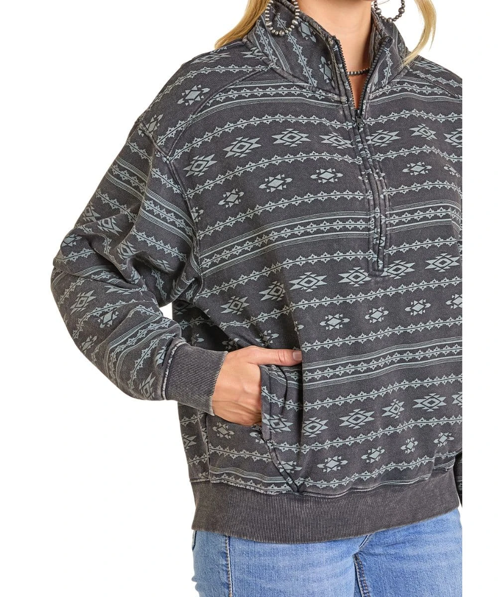 80% Cotton/20% Polyester; Long Sleeves; Mock Collar; 1/4 Zip Closure; Dropped Shoulders; Hand Pockets; Ribbed Cuffs And Hem; Aztec Stripe Print; Color: Black; Style #BW91T06972