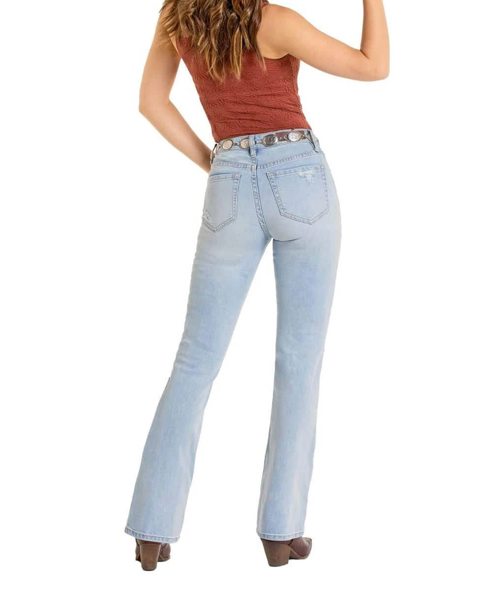 99% Cotton/1% Spandex; High Rise; Zip Fly With Button Closure; Five Pocket Styling; Whisker, Hand Sanding, And Distressed Detailing; Boot Cut Leg; Color: Light Wash; Style #BW4HD06388