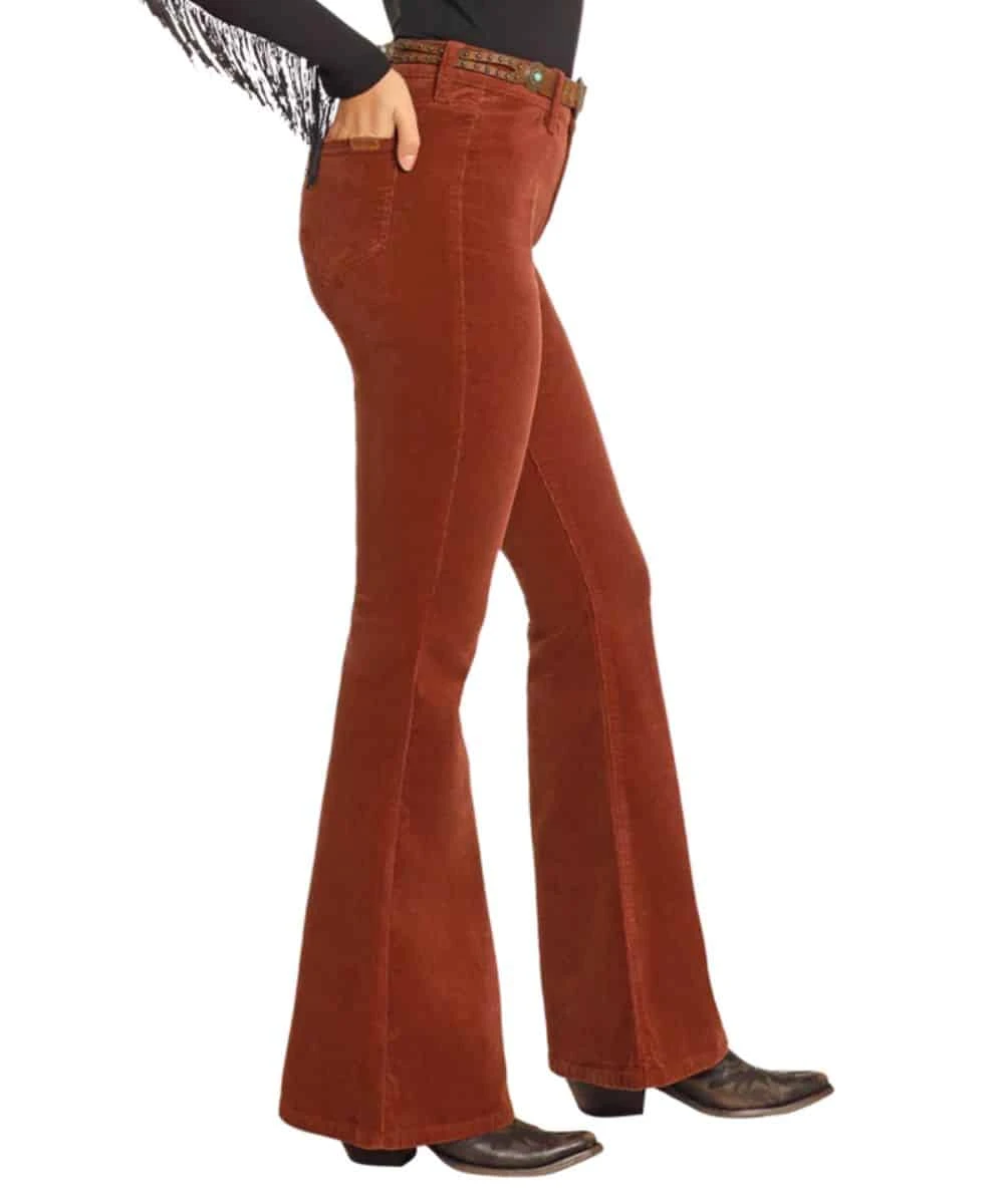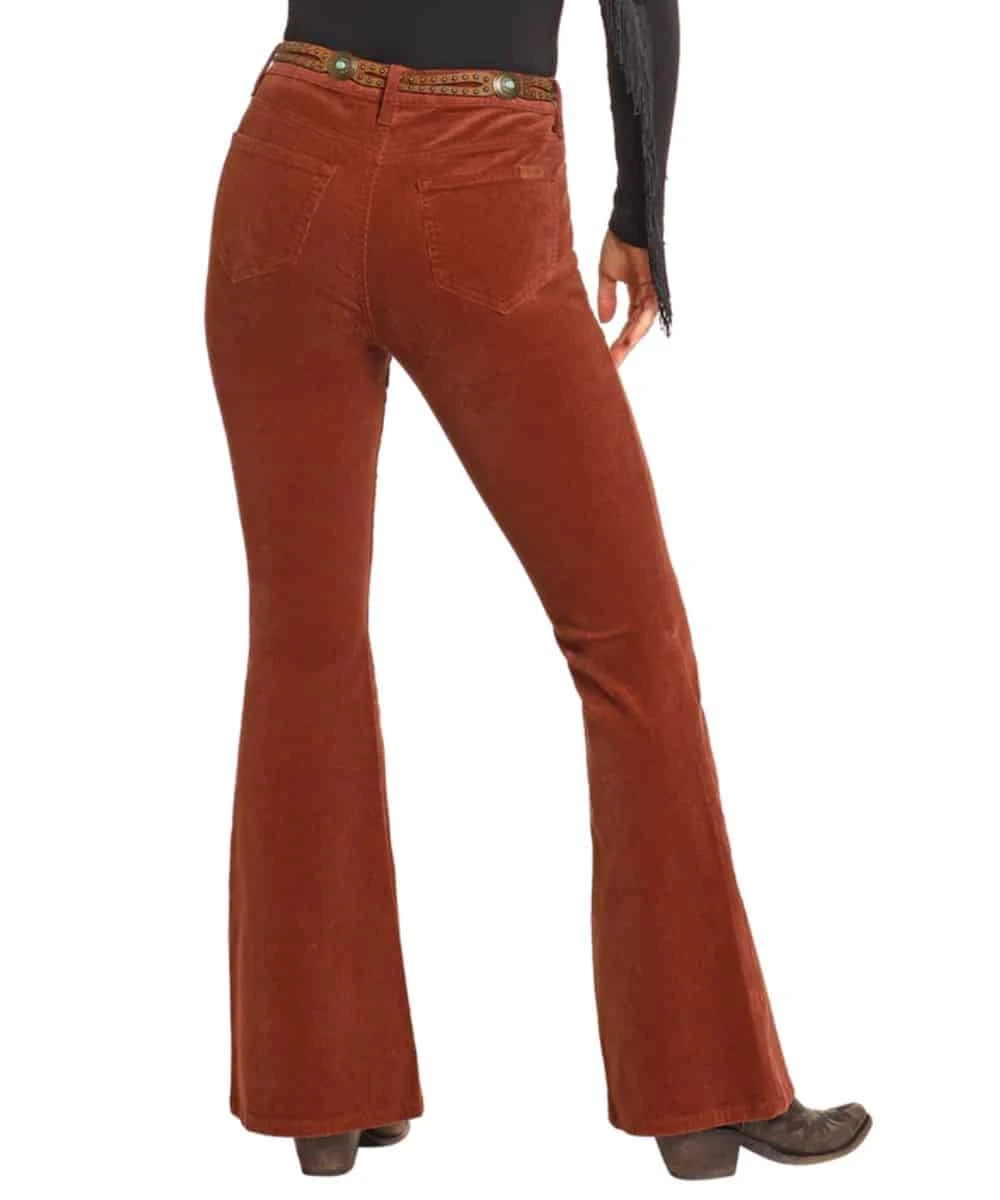 98% Cotton/2% Spandex; Slim Fit; High Rise; Zip Fly With Button Closure; Two Pocket Styling; Corduroy Denim; Flare Leg; Color: Rust/Orange; Style #BW6PD04746