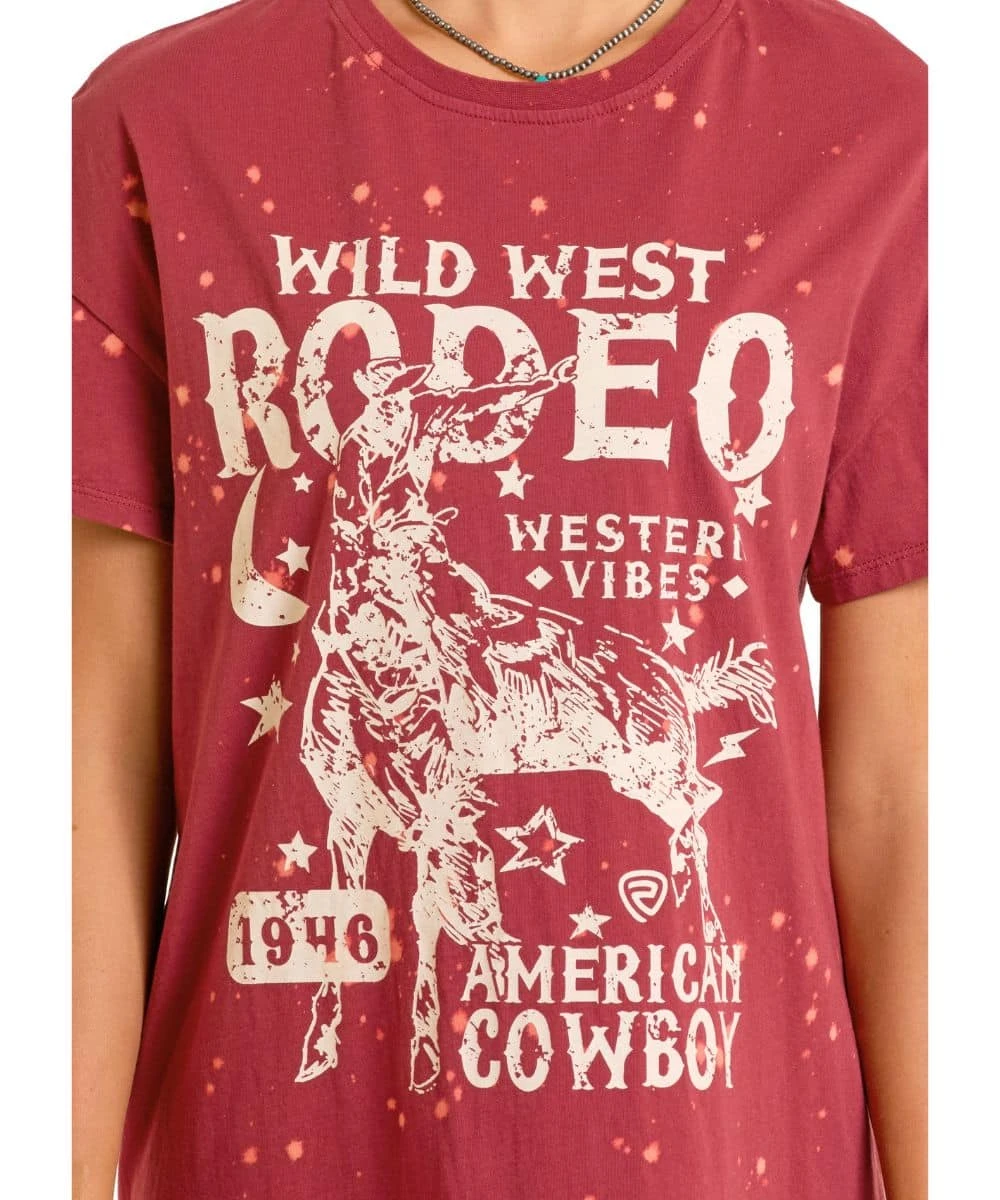 100% Cotton; Short Sleeves; Crew Neckline; Front Screen-Printed Rodeo Graphic Reads: “Wild West Rodeo – Western Vibes – American Cowboy”; Bleached; Color: Wine; Style #BWD1R06452