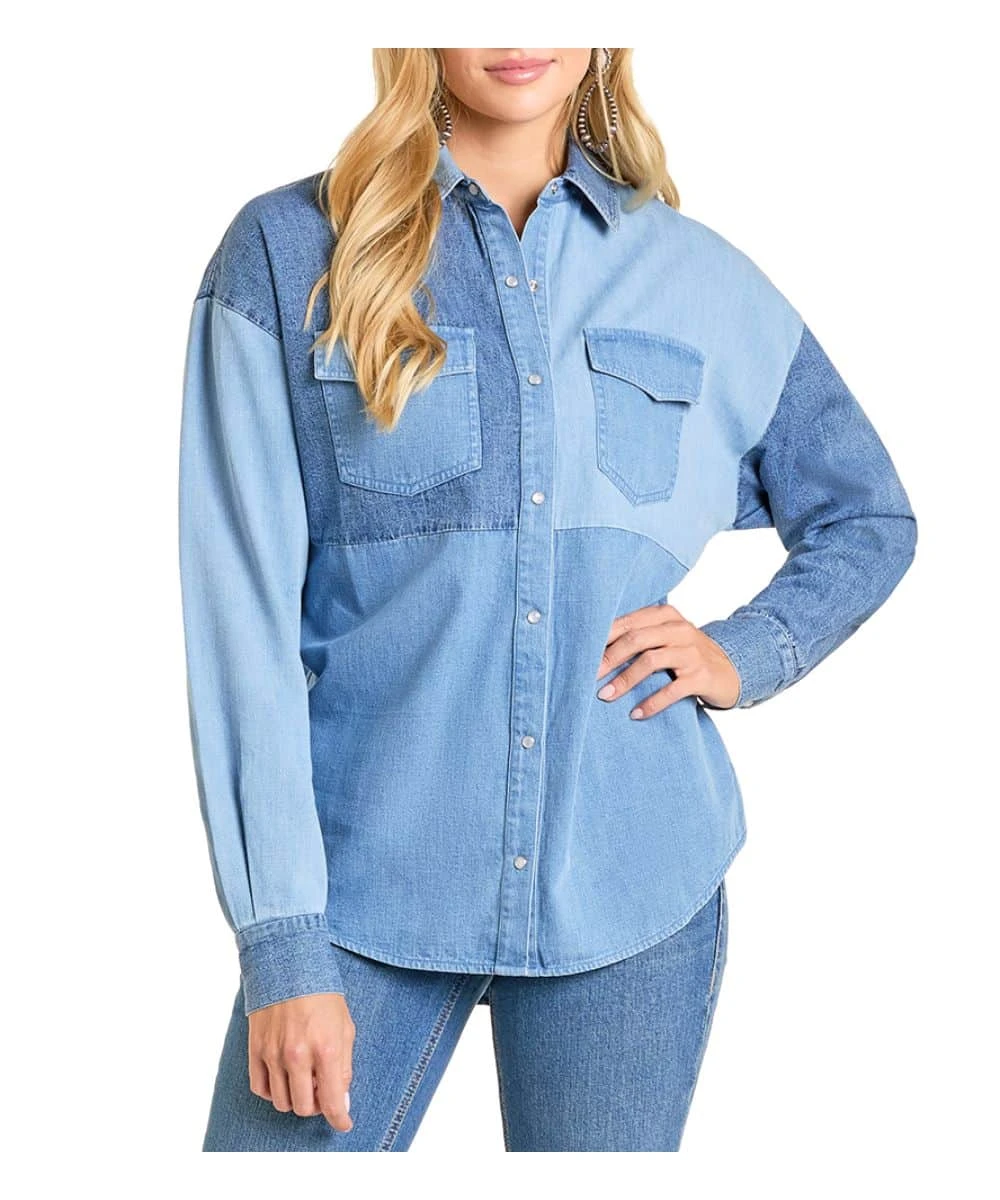 100% Cotton; Long Sleeves; Spread Collar; Snap Front Placket And Cuffs; Single Point Flap Chest Pockets; Single Point Back Yoke; Denim Patchwork Design; Color: Blue; Style #BWN2S06944