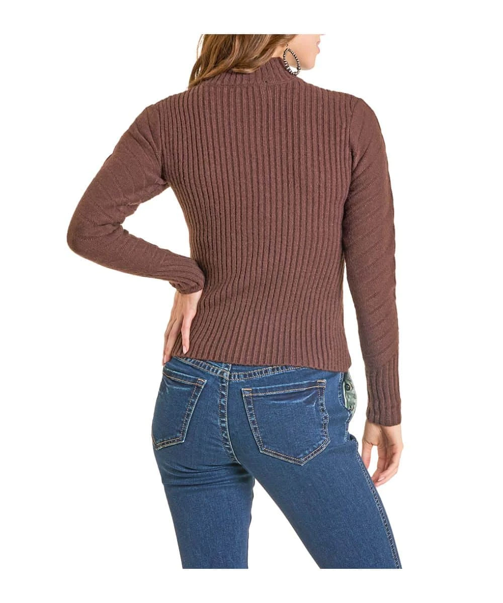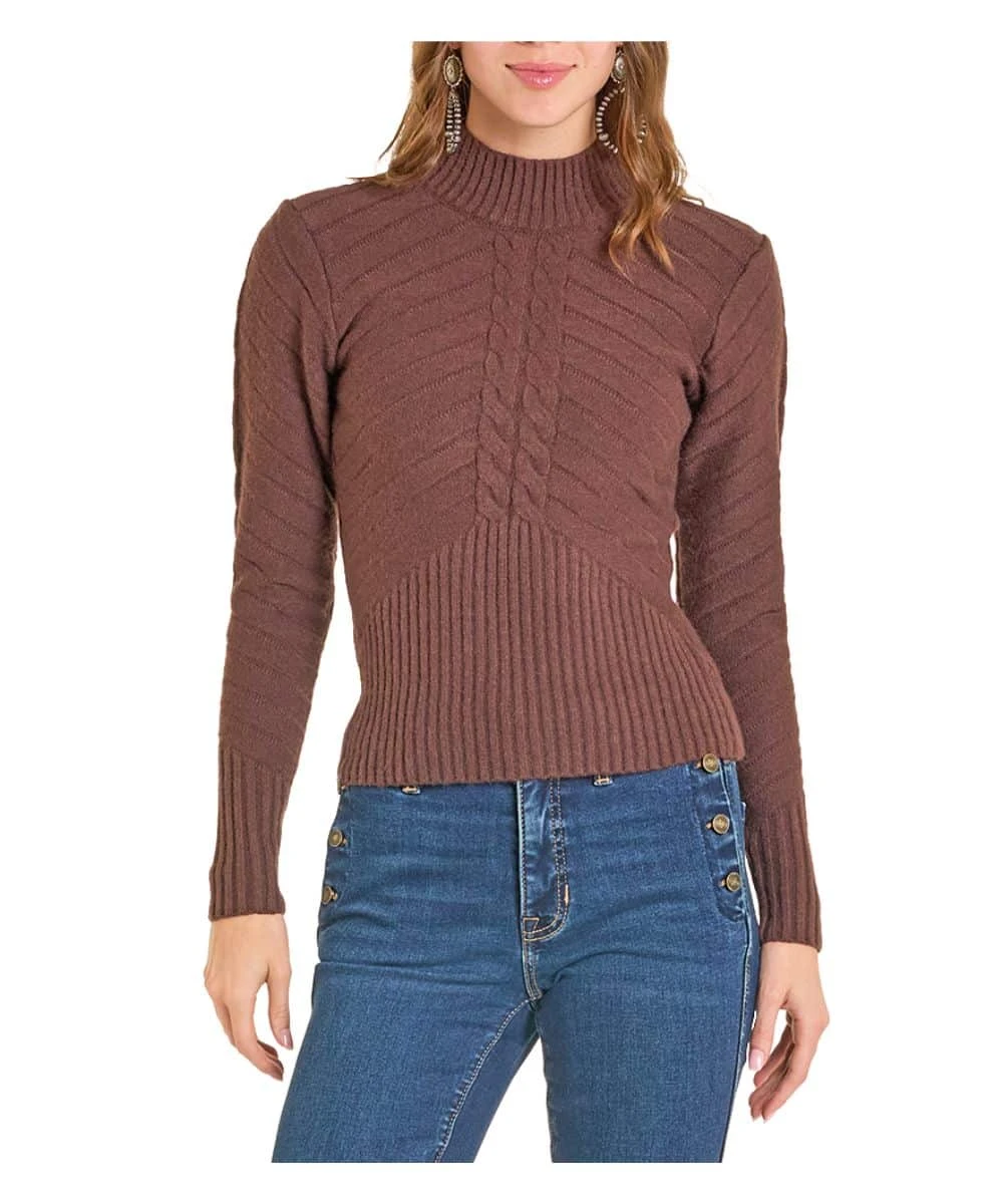88% Polyester/12% Nylon; Long Sleeves; Mock Neck; Cable Knit Sweater; Color: Brown; Style #BW32T06979