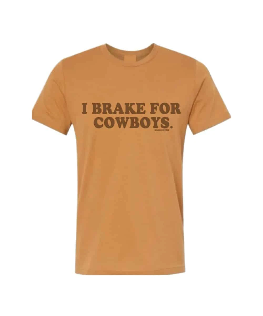 100% Cotton; Bella Canvas Tee; Unisex Fit; Short Sleeves; Crew Neck; Front Screen Print Reads: “I Brake For Cowboys.”; Style #BRAKE FOR COWBOYS TEE