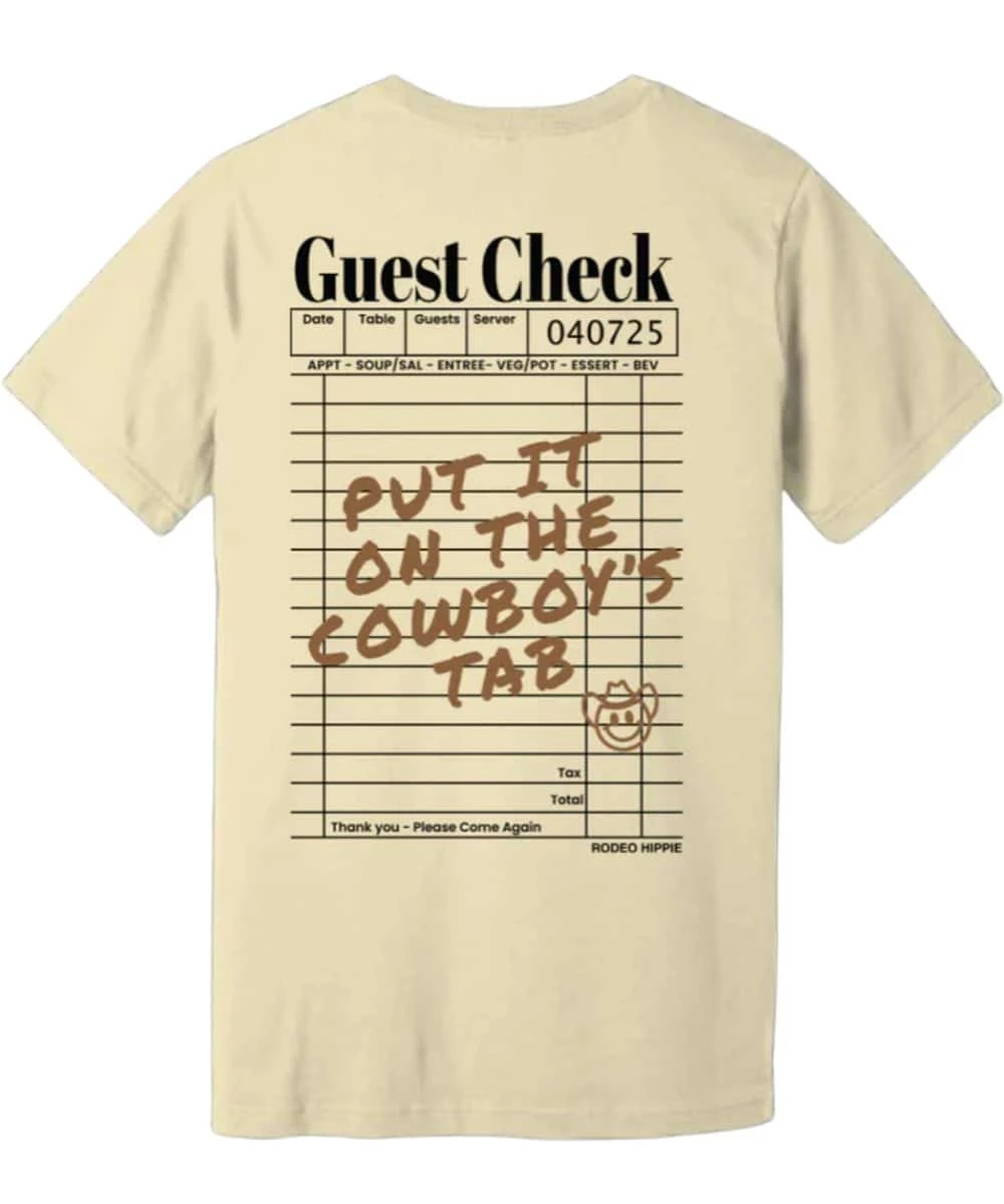 100% Cotton; Bella Canvas Tee; Unisex Fit; Short Sleeves; Crew Neck; Small Logo Screen Printed On Front Chest With Smiley Graphic; Large Guest Check Graphic Screen Printed On Back Reads: “Put It On The Cowboys Tab”; Style #GUEST CHECK TEE