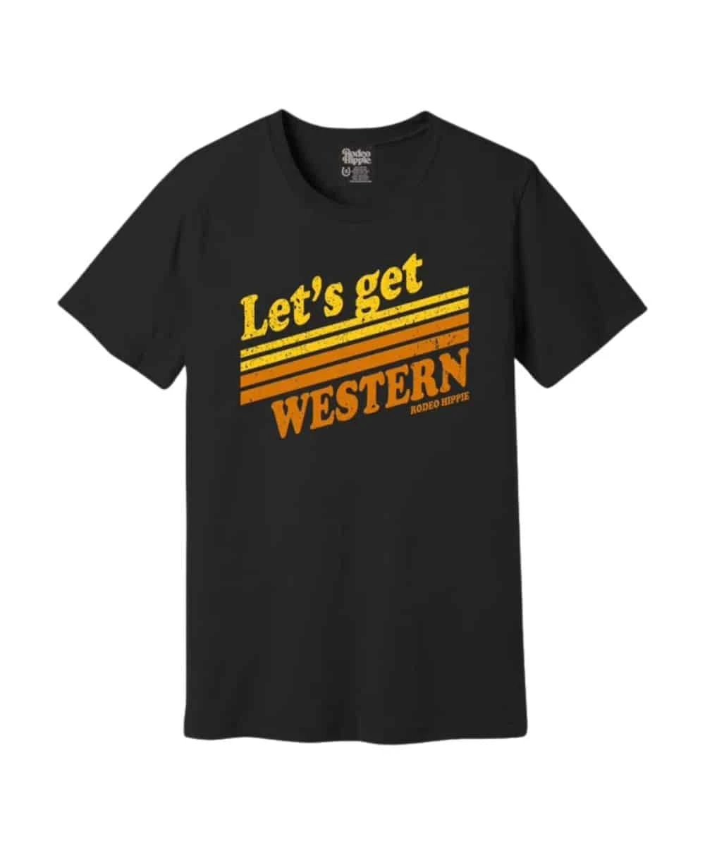 100% Cotton; Bella Canvas Tee; Unisex Fit; Short Sleeves; Crew Neck; Front Retro Screen Print Reads: “Let’s Get Western”; Style #LETS GET WESTERN TEE
