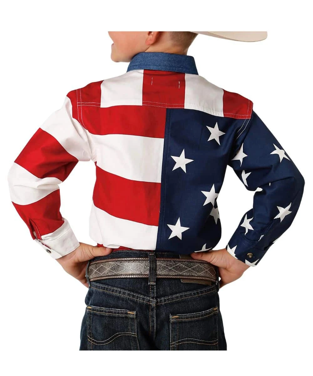 100% Cotton; Long Sleeves; Button Down Collar, Placket, And Cuffs; Denim Collar; Tortoise Buttons; Single Point Open Chest Pocket; Straight Back Yoke; Pieced Twill Fabrics With U.S.A Flag Print; Color: Red/White/Blue; Style #03-030-0185-0101