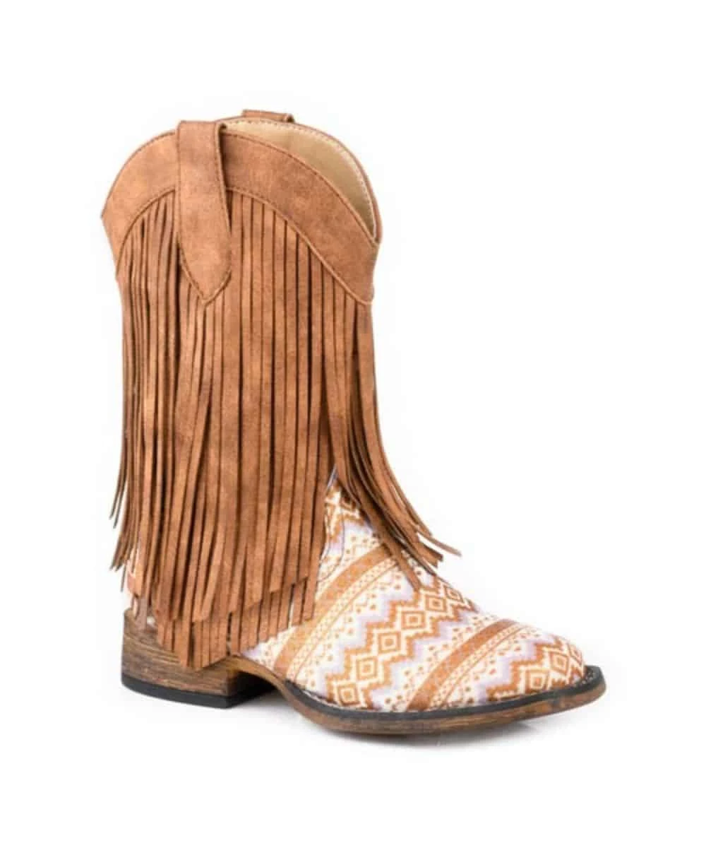 9″ Shaft; Faux Leather Boot; Tan Aztec Glitter Vamp; Vintage Tan Double Fringe Shaft; Leather Pull Tabs For Easy On; Synthetic Moisture Wicking Lining; Padded Cushion Insole; Flexible TPR Sole; 1″ Heel; Wide Square Toe; Style #09-018-1903-3503