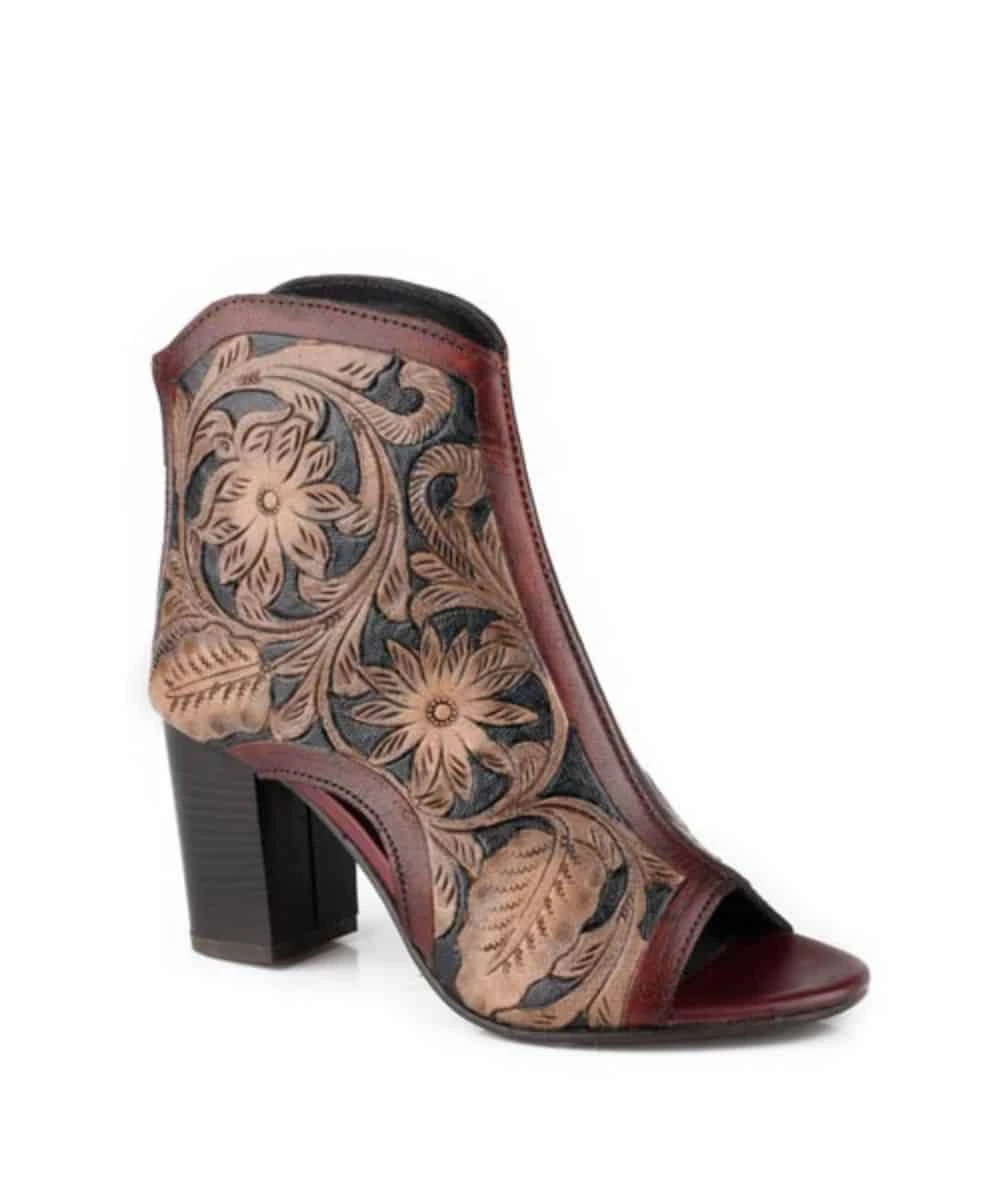 Multi Brown Floral Tooling With Black; Back Zipper Entry For Easy On/Off; Leather Lining; Pig Suede Padded Sock; Flexible TPR Sole; 3″ Imitation Wood Heel; Open Toe; Style #09-021-0946-3530