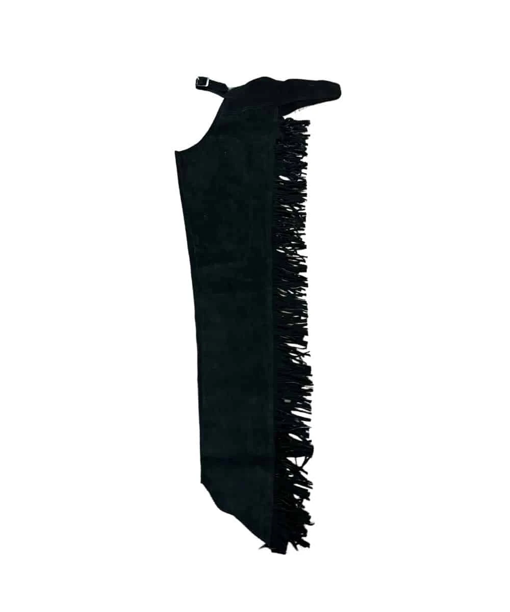 Deluxe Roughout Leather Chaps; Full Length Heavy Duty Zippers On Each Leg And Elastic For Snug Fitting; Adjustable Front And Back Buckles For Secure Fit; Concho And Fringe Detailing; Color: Black; Style #6LC102L