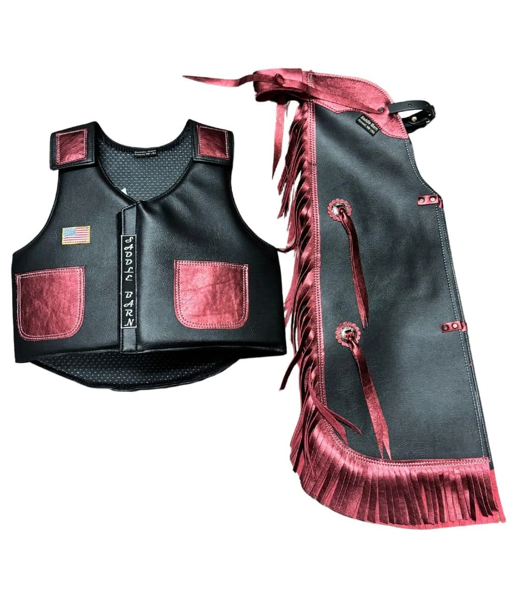 Faux Leather; Velcro Vest Closure; Leather Vest Pockets; Fringe And Tassels On Chaps; One Size Fits Most; Color: Black And Red; Style #27-74BLK/RED