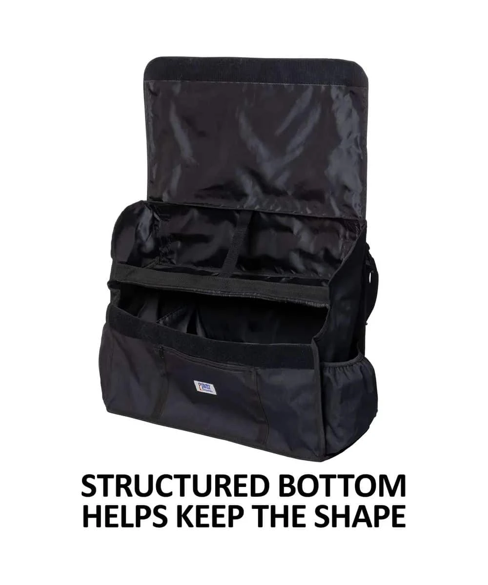 Durable 600D Poly; Two Adjustable Hanging Straps At Top Of Bag; Plexiglass Supported Bottom Helps Bag Keep Its Shape; Zipper Front For Small Accessories; Pockets On Sides; Shelf Inside; Two Pockets Inside; Measures Approximately: 14.5″ T x 20″ L x 8″ D; Color: Black; Style #43404