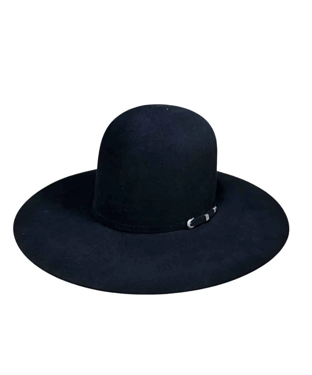 100X; Open Crown; 4 1/4″ Brim; Leather Sweatband; Color: Black; Style #100XRANCHERFO