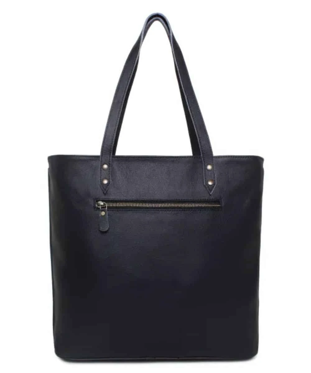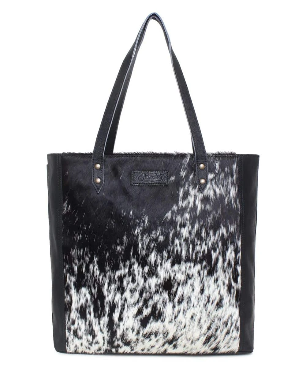 Leather/Hair-On Leather; Leather Carry Straps; 10″ Drop; Zipper Pocket At Back; YKK Brass Zipper Closure; Polyester/Cotton Step Logo Printed Interior Lining; Main Compartment With 1 Zip Pocket And 2 Slip Pockets; Antique Finished Metal Fittings; Measures Approximately: 13.5″ H x 18″ W x 4″ D; Color: Black; Style #SB-2057-B