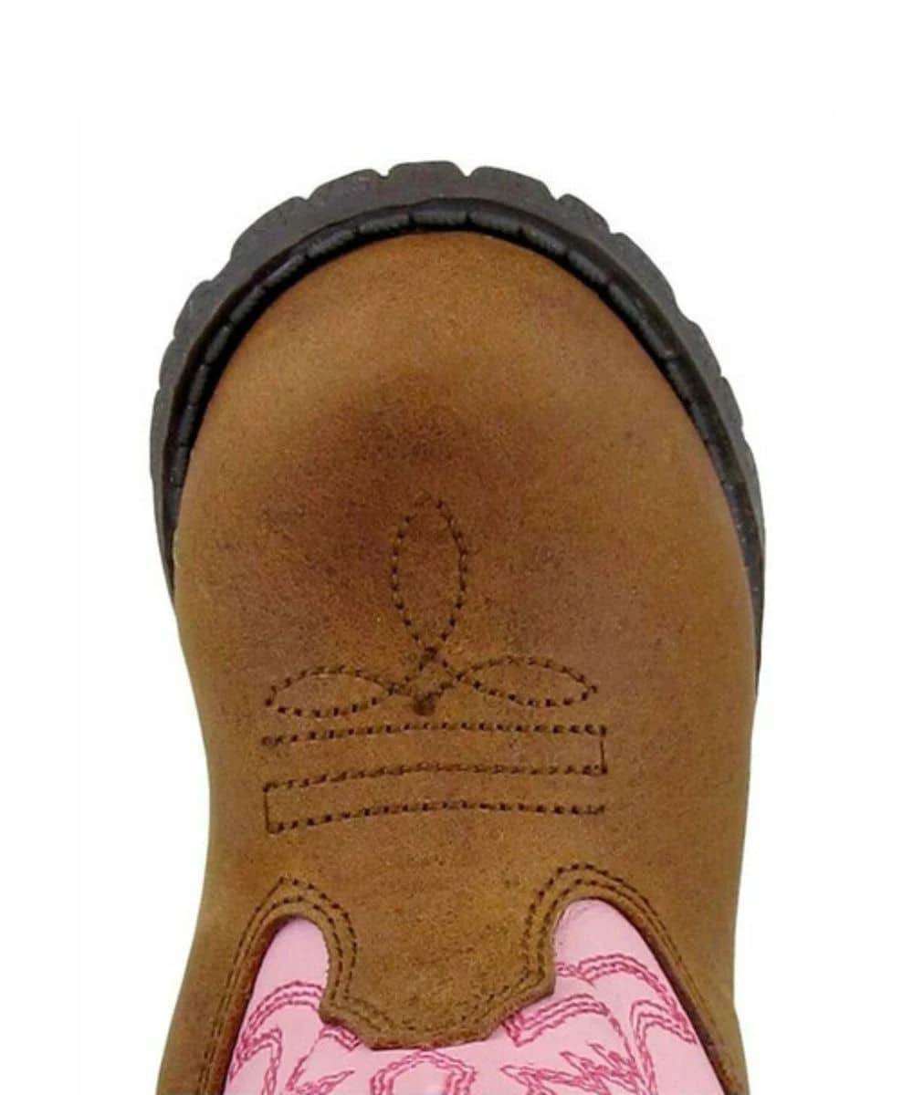 5.5″ Shaft; Leather Boot; Distressed Brown Foot; Pink Upper With Western Stitching; Leather Pull Tabs And Side Zipper For Easy On; Man-Made Lining; Rubber Sole; Walking Heel; U-Toe; Color: Brown/Pink; Style #3246T