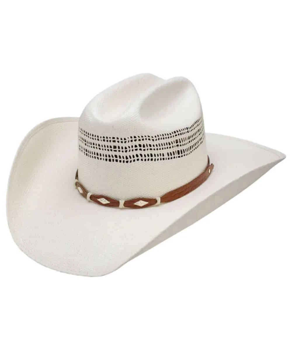 Bangora Straw; 4 1/4″ Brim; 4 3/8″ Cattleman Crown; Vented Crown; Southwestern Hat Band With Silver Hooey Pendants; Color: Natural; Style #SSBLLY-7342