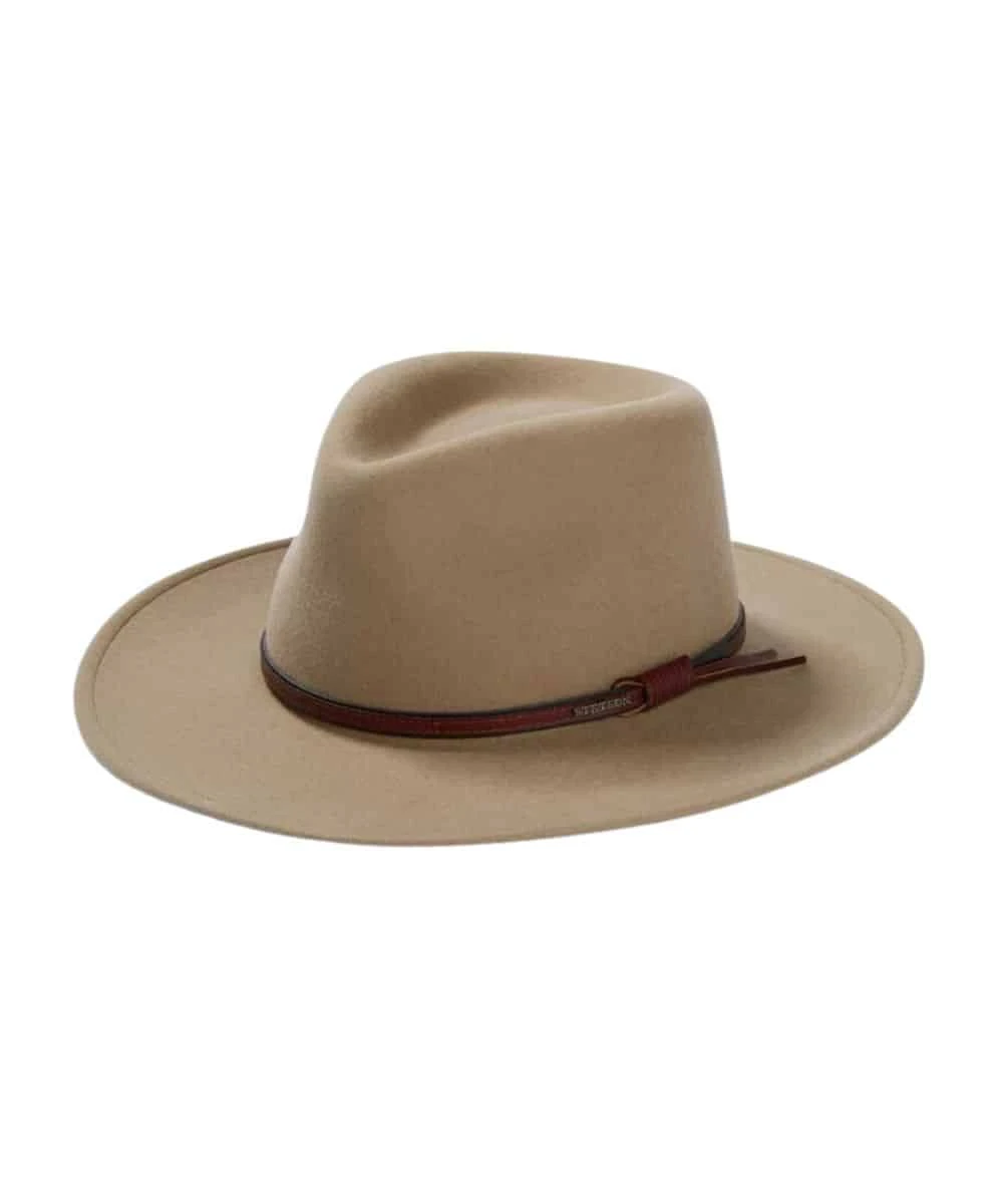 Wool; Color: Light Brown, Black, And Mushroom; Pinch Front Crown; Crown: 4″; Brim: 3-1/4″; Water Repellant Felt; Crushable; Leather Hatband; Drilex Leather Sweatband; Style #TWBOZE-8130