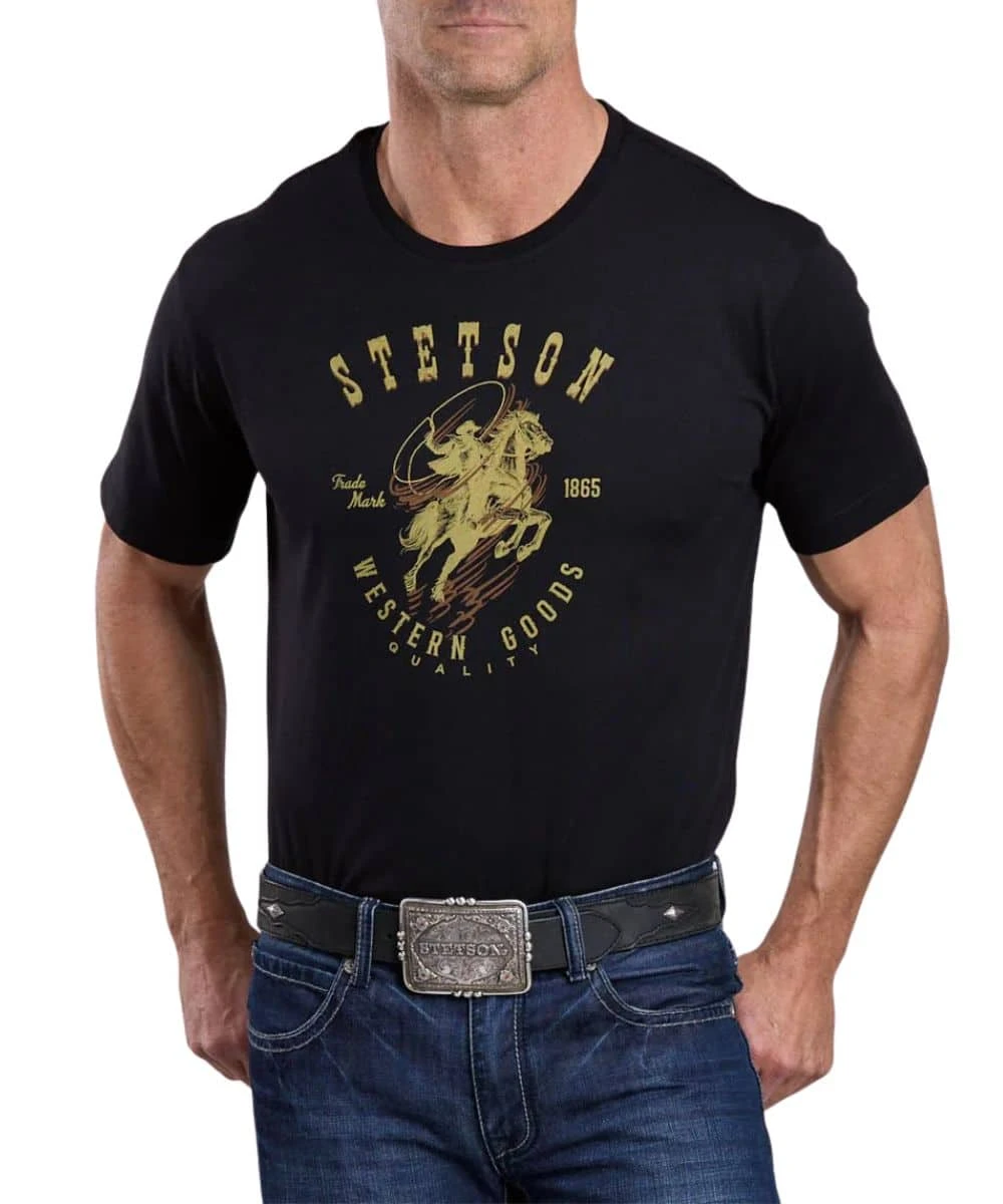100% Cotton; Relaxed Fit; Short Sleeves; Ribbed Crew Neck; Gold And Burnt Orange Stetson Dust Devil Lasso Rider Screenprint On Center Front; Double Needle Stitched Hem; Fabric Washed For Soft Hand; Color: Black; Style #11-076-0562-0891