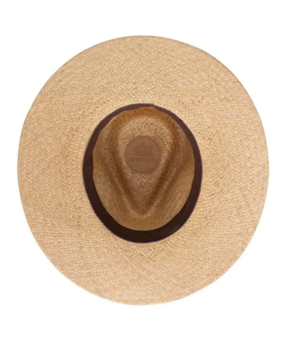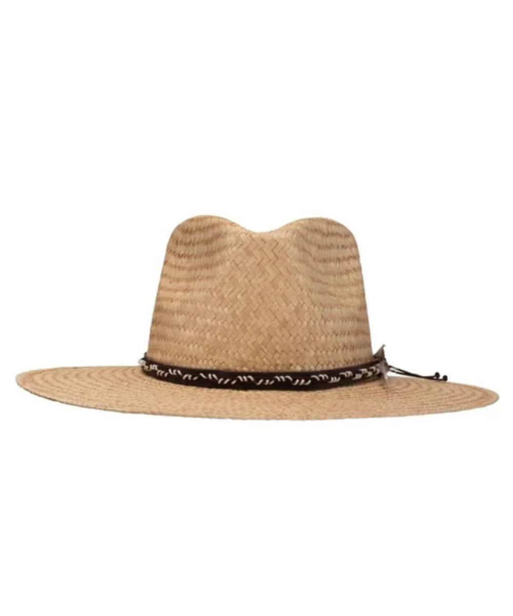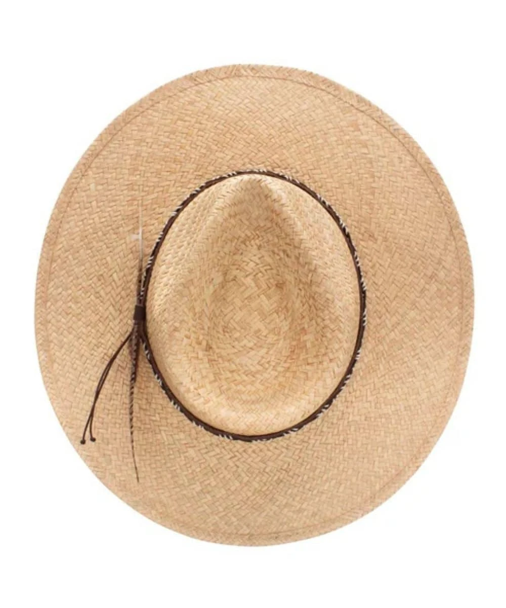 Made From Natural Tan Straw; 3 5/8″ Flat Brim; Pinched Front Crown; Brown Leather Hat Band With Feather Accent; Color: Tan; Style #OSGRLP-3835