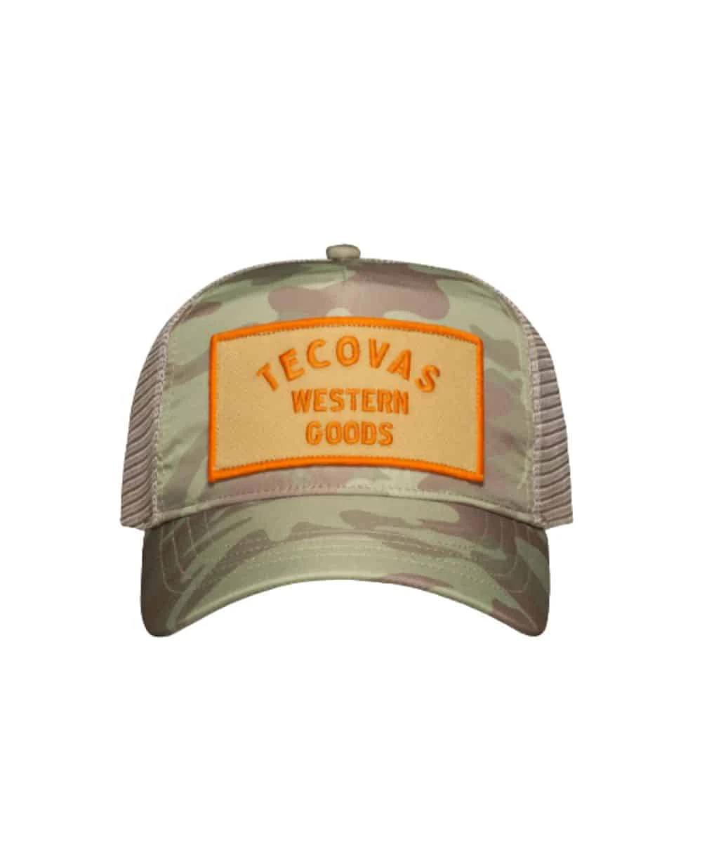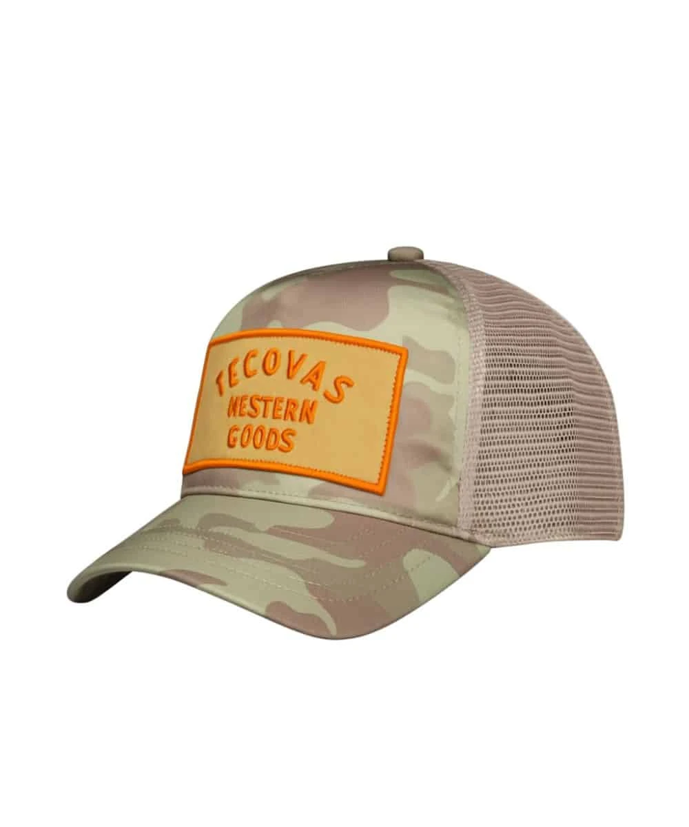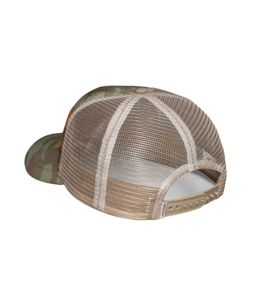 Five Panel Construction; Low-Profile Fit; Camo Front And Bill; Yellow/Orange Contrasting Embroidered Twill Logo Patch On Front; Low-Crown Design; High-Curve Brim; Moisture Wicking Headband; Khaki Mesh Sides And Back; Adjustable Snapback Closure; One Size Fits Most; Color: Camo/Khaki; Style #30265