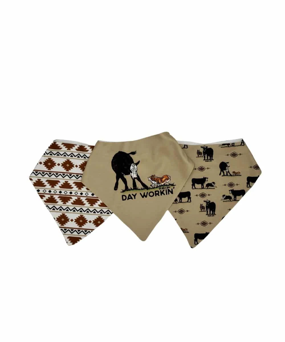 Day Workin’ Package Of 3 Bibs: 1 Cow/Dog Bib, 1 “Day Workin’”, And 1 White With Aztec Print; Super Absorbent And Drool Proof Bibs For Teething Cowbabes; Snap Closure; All Prints Are Hand Drawn; Style #K3079-9
